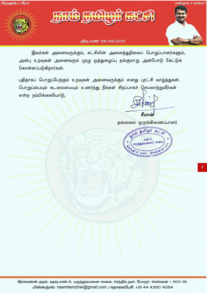 இவர்கள் அனைவருக்கும், கட்சியின் அனைத்துநிலைப் பொறுப்பாளர்களும், அன்பு உறவுகள் அனைவரும் முழு ஒத்துழைப்பு நல்குமாறு அன்போடு கேட்டுக் கொள்ளப்படுகிறார்கள்.