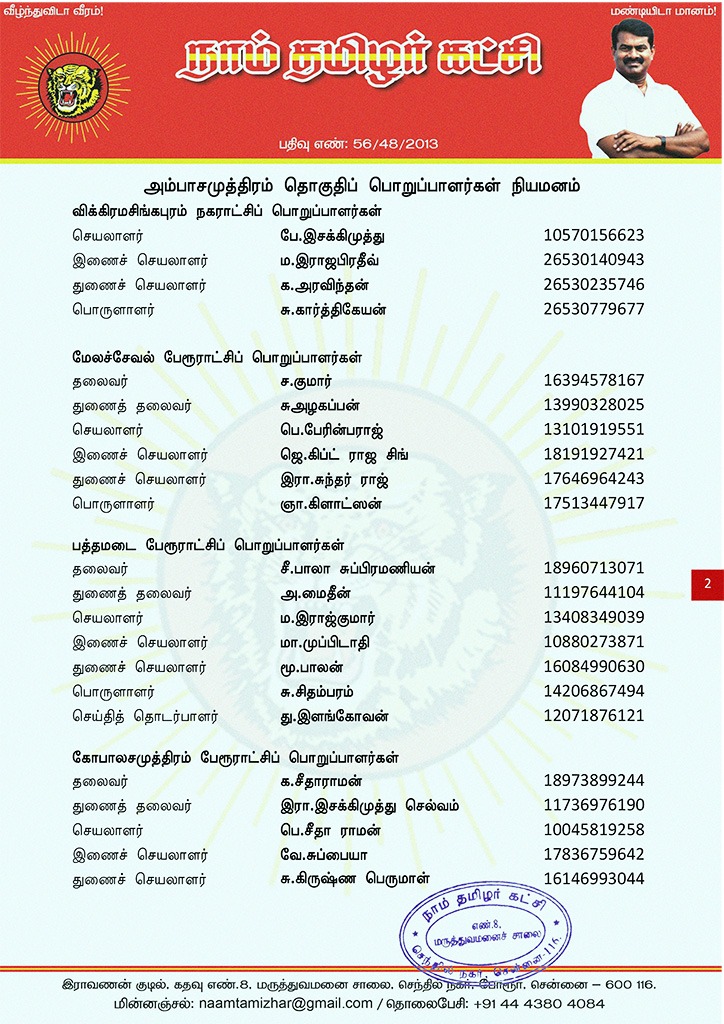 மேற்காண் அனைவரும் நாம் தமிழர் கட்சி – அம்பாசமுத்திரம் தொகுதிப் பொறுப்பாளர்களாக நியமிக்கப்படுகிறார்கள். இவர்கள் அனைவருக்கும், கட்சியின் அனைத்துநிலைப் பொறுப்பாளர்களும், அன்பு உறவுகள் அனைவரும் முழு ஒத்துழைப்பு நல்குமாறு அன்போடு கேட்டுக் கொள்ளப்படுகிறார்கள்.
