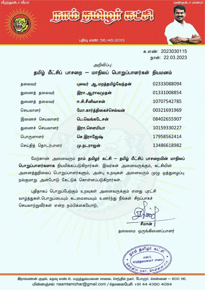 மேற்காண் அனைவரும் நாம் தமிழர் கட்சி – தமிழ் மீட்சிப் பாசறையின் மாநிலப் பொறுப்பாளர்களாக நியமிக்கப்படுகிறார்கள். இவர்கள் அனைவருக்கும், கட்சியின் அனைத்துநிலைப் பொறுப்பாளர்களும், அன்பு உறவுகள் அனைவரும் முழு ஒத்துழைப்பு நல்குமாறு அன்போடு கேட்டுக் கொள்ளப்படுகிறார்கள்.