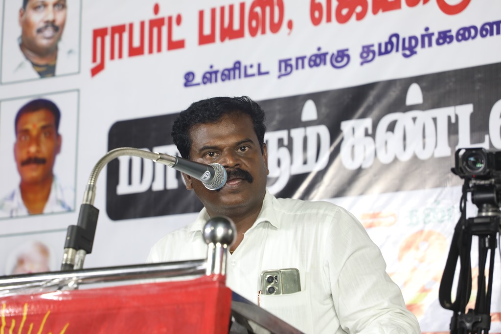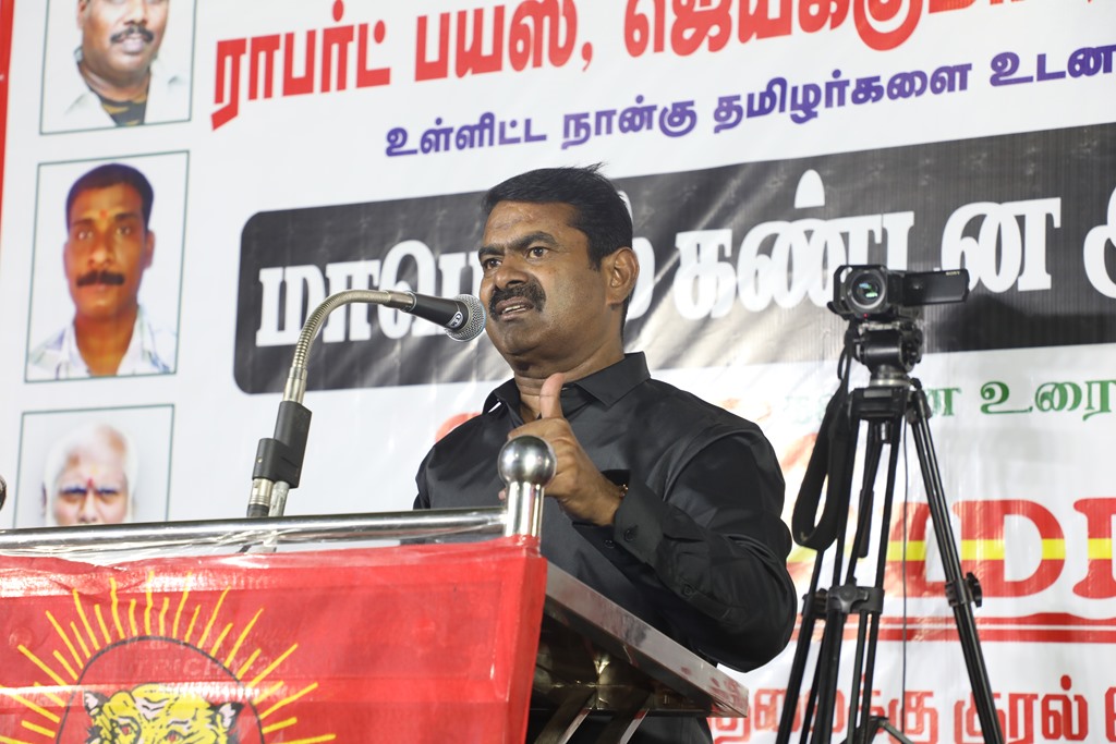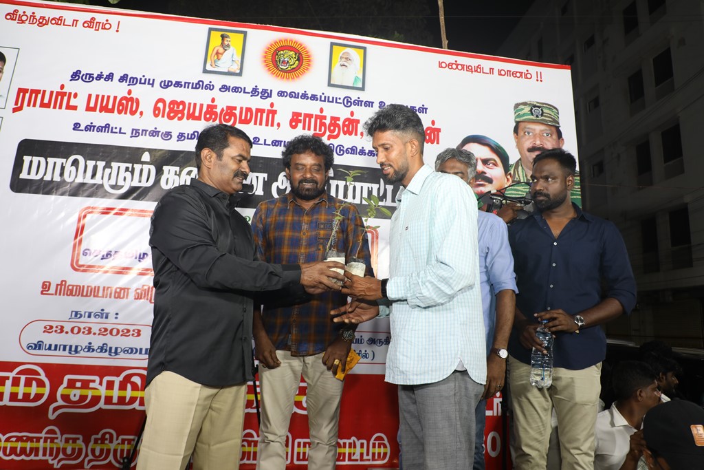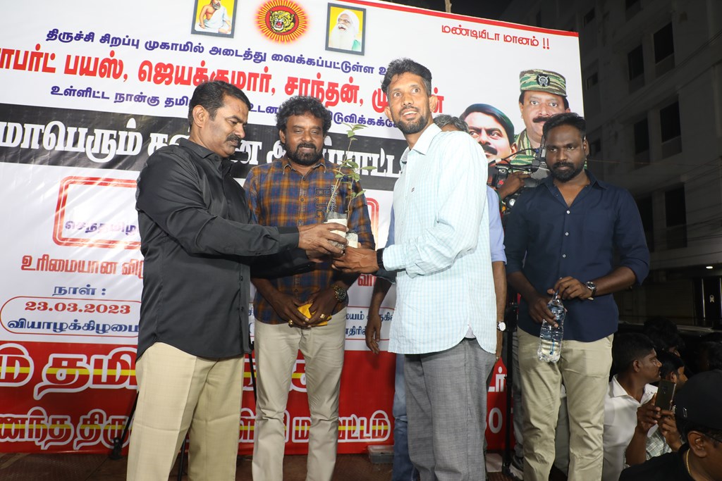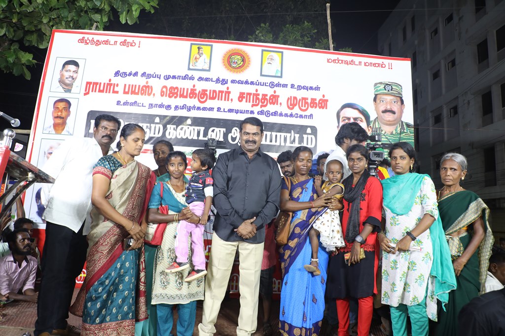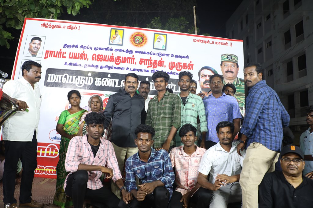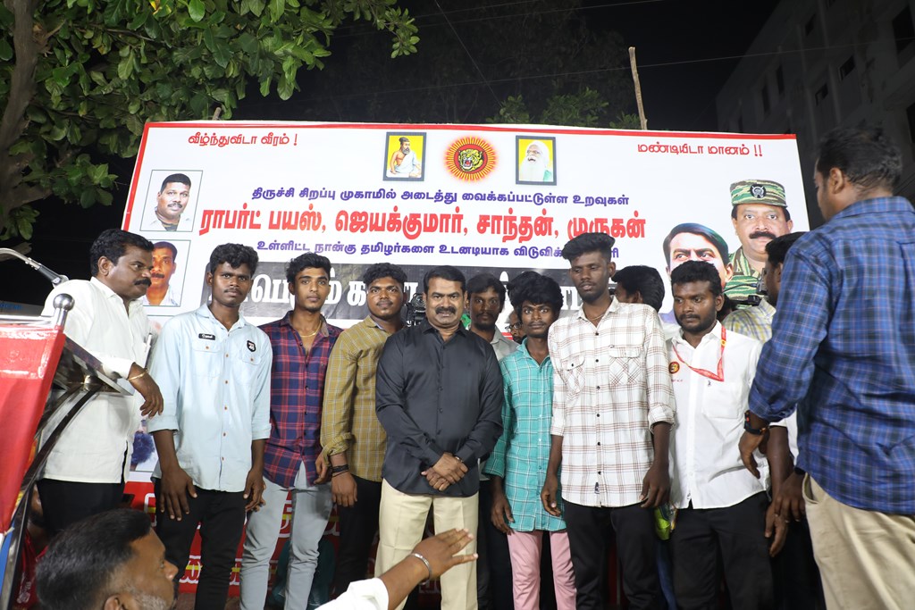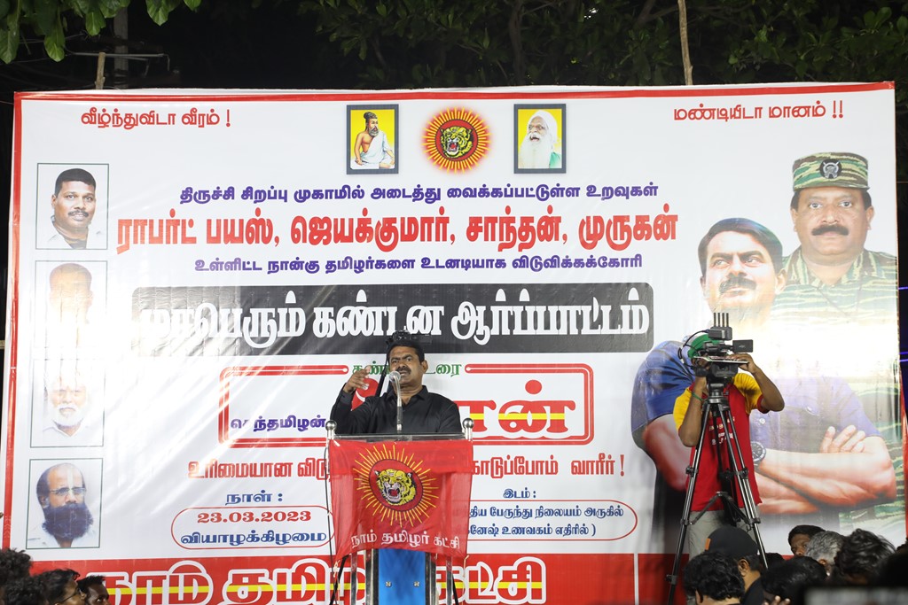 31 ஆண்டுகளுக்கும் மேலான கொடுஞ்சிறைவாசத்திற்குப் பிறகு விடுதலை செய்யப்பட்டும், வெளியில் விடாமல் திருச்சி சிறப்பு முகாமில் அடைத்து வைக்கப்பட்டுள்ள உறவுகள் ராபர்ட் பயஸ், ஜெயக்குமார், சாந்தன், முருகன் உள்ளிட்ட நான்கு தமிழர்களை உடனடியாக விடுவித்து, அவர்கள் விரும்பிய வாழ்க்கையை வாழ வழிவகை செய்வதற்குரிய சட்டரீதியான நடவடிக்கைகளை தமிழ்நாடு அரசு விரைந்து முன்னெடுக்க வலியுறுத்தி நாம் தமிழர் கட்சியின் தலைமை ஒருங்கிணைப்பாளர் செந்தமிழன் சீமான் அவர்கள் தலைமையில் 23-03-2023 அன்று திருச்சி மத்திய பேருந்து நிலையம் அருகில் மாபெரும் கண்டன பொதுக்கூட்டம் நடைப்பெற்றது.