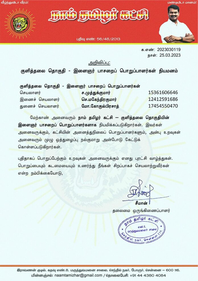 மேற்காண் அனைவரும் நாம் தமிழர் கட்சி – குளித்தலை தொகுதியின் இளைஞர் பாசறைப் பொறுப்பாளர்களாக நியமிக்கப்படுகிறார்கள். இவர்கள் அனைவருக்கும், கட்சியின் அனைத்துநிலைப் பொறுப்பாளர்களும், அன்பு உறவுகள் அனைவரும் முழு ஒத்துழைப்பு நல்குமாறு அன்போடு கேட்டுக் கொள்ளப்படுகிறார்கள்.