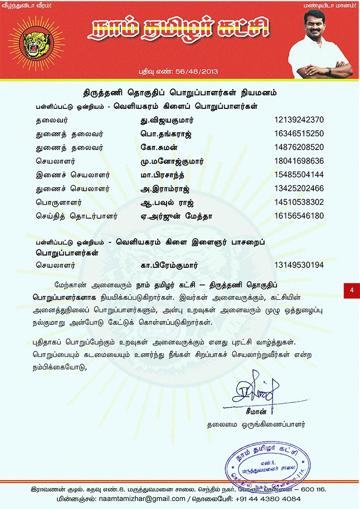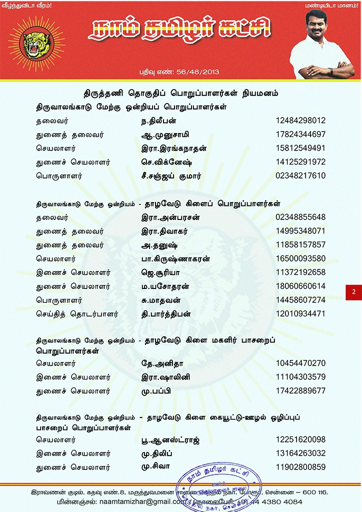 மேற்காண் அனைவரும் நாம் தமிழர் கட்சி – திருத்தணி தொகுதிப் பொறுப்பாளர்களாக நியமிக்கப்படுகிறார்கள். இவர்கள் அனைவருக்கும், கட்சியின் அனைத்துநிலைப் பொறுப்பாளர்களும், அன்பு உறவுகள் அனைவரும் முழு ஒத்துழைப்பு நல்குமாறு அன்போடு கேட்டுக் கொள்ளப்படுகிறார்கள்.