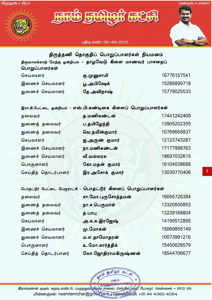 மேற்காண் அனைவரும் நாம் தமிழர் கட்சி – திருத்தணி தொகுதிப் பொறுப்பாளர்களாக நியமிக்கப்படுகிறார்கள். இவர்கள் அனைவருக்கும், கட்சியின் அனைத்துநிலைப் பொறுப்பாளர்களும், அன்பு உறவுகள் அனைவரும் முழு ஒத்துழைப்பு நல்குமாறு அன்போடு கேட்டுக் கொள்ளப்படுகிறார்கள்.