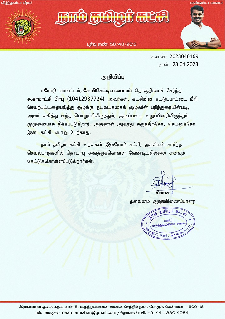 சு.காமாட்சி பிரபு (10412937724) அவர்கள், கட்சியின் கட்டுப்பாட்டை மீறி செயற்பட்டதையடுத்து ஒழுங்கு நடவடிக்கைக் குழுவின் பரிந்துரையின்படி, அவர் வகித்து வந்த பொறுப்பிலிருந்தும், அடிப்படை உறுப்பினரிலிருந்தும் முழுமையாக நீக்கப்படுகிறார். அதனால் அவரது கருத்திற்கோ, செயலுக்கோ இனி கட்சி பொறுப்பேற்காது.