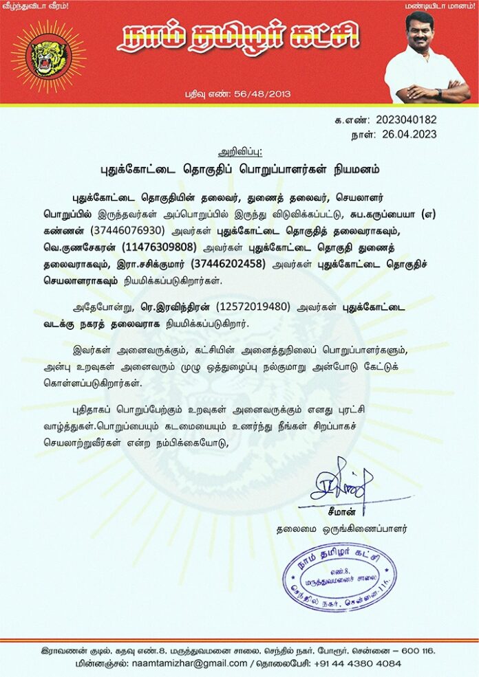 அதேபோன்று, ரெ.இரவிந்திரன் (12572019480) அவர்கள் புதுக்கோட்டை வடக்கு நகரத் தலைவராக நியமிக்கப்படுகிறார்.