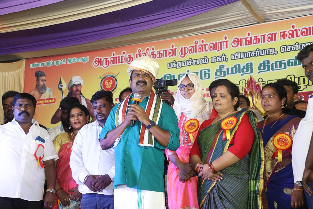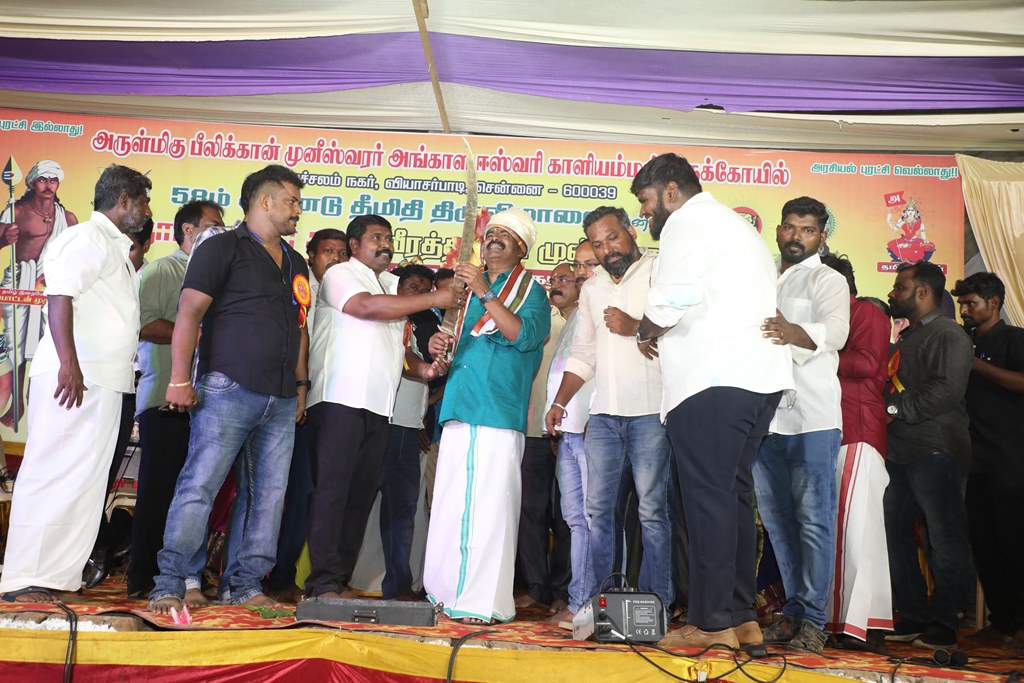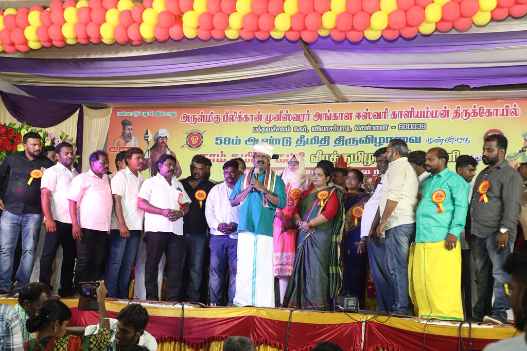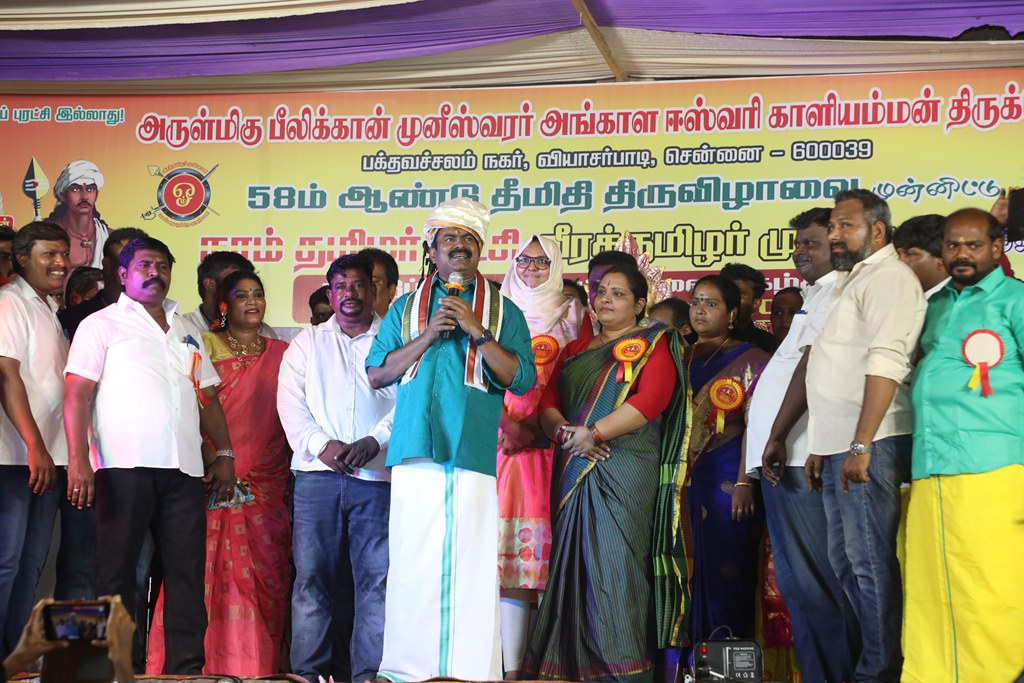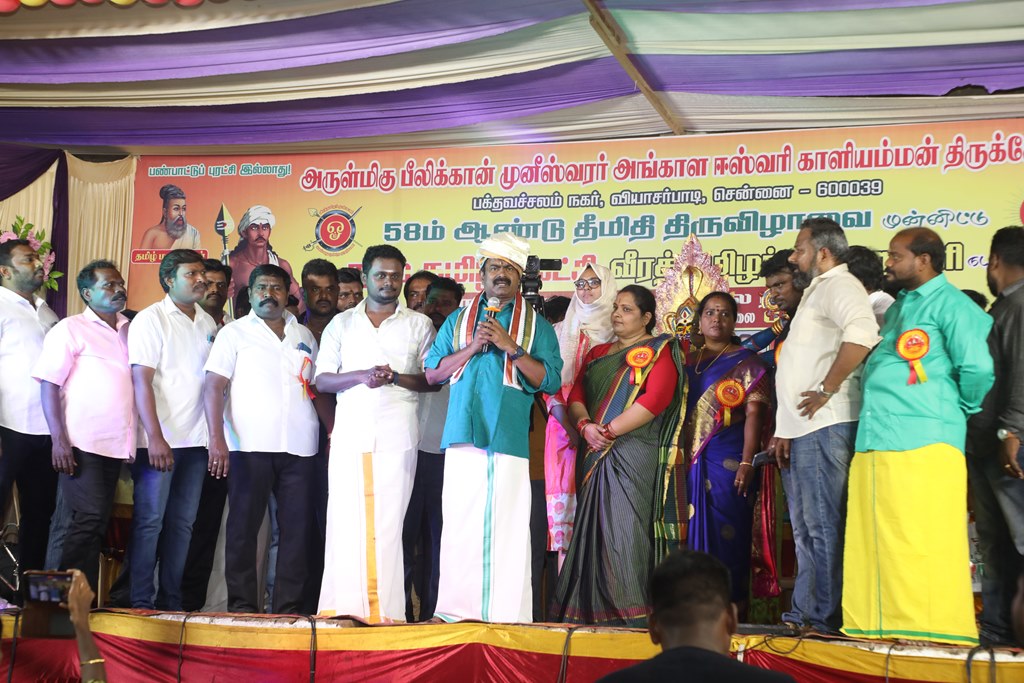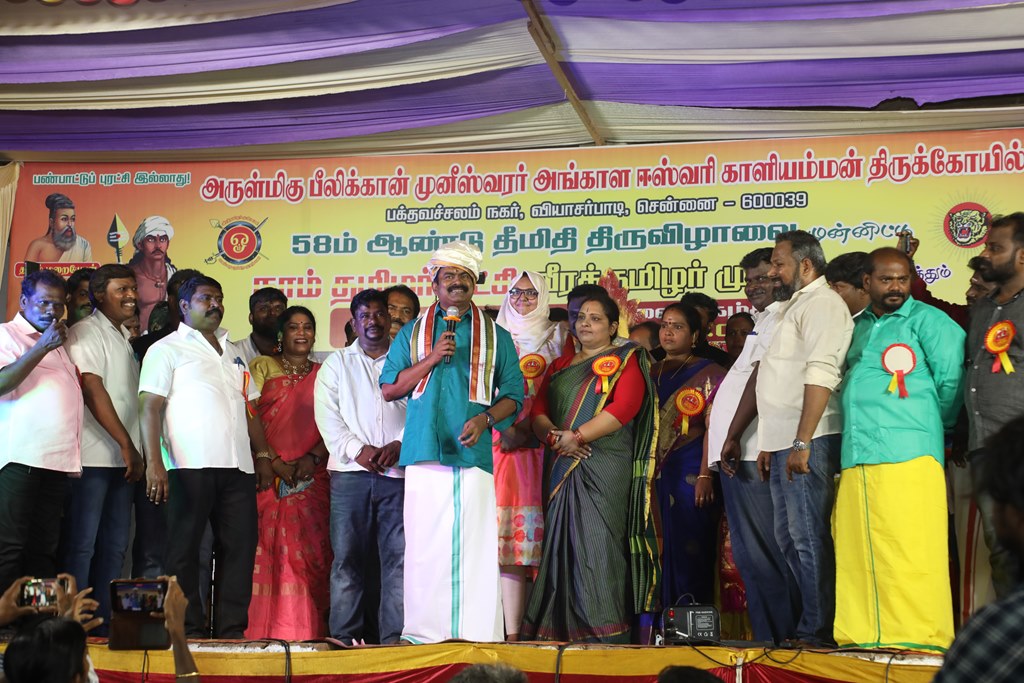 சென்னை, வியாசர்பாடி, பக்தவச்சலம் நகரில் அமைந்துள்ள அருள்மிகு பீலிக்கான் முனிஸ்வரர் அங்காள ஈஸ்வரி காளியம்மன் திருக்கோயிலில் நடைபெறும் 58ஆம் ஆண்டு தீமிதி திருவிழாவை முன்னிட்டு, நாம் தமிழர் கட்சி – வடசென்னை தெற்கு மாவட்டம் மற்றும் வீரத்தமிழர் முன்னணி சார்பாக