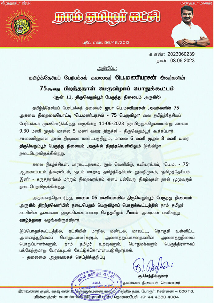 தமிழ்த்தேசியப் பேரியக்கத் தலைவர் ஐயா பெ.மணியரசன் அவர்களின் 75 அகவை நிறைவையொட்டி “பெ.மணியரசன் – 75 பெருவிழா” வை தமிழ்த்தேசியப் பேரியக்கம் முன்னெடுக்கிறது. வருகின்ற 11-06-2023 ஞாயிற்றுக்கிழமையன்று காலை 9.30 மணி முதல் மாலை 5 மணி வரை திருச்சி – திருவெறும்பூர் கூத்தப்பார் சாலையிலுள்ள தாஸ் திருமண மண்டபத்திலும், மாலை 6 மணி முதல் 8 மணி வரை திருவெறும்பூர் பேருந்து நிலையம் அருகில் திறந்தவெளியிலும் இவ்விழா நடைபெறவிருக்கின்றது.