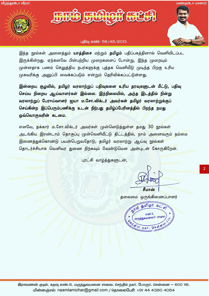 நமது இனத்தின் விடுதலை என்பது தமிழர் நிலத்தில் நாம் பெற இருக்கின்ற அரசியல் அதிகாரத்தை உள்ளடக்கியது என்பதை நீங்கள் அறிவீர்கள். அரசியல் விடுதலை என்பது பெரும்பகுதி நாம் பெறவேண்டிய வரலாற்று விடுதலையில் இருக்கிறது. அண்மை காலங்களில் தமிழர்களின் வரலாறு திட்டமிட்டு அழிக்கப்பட்டும், இருக்கின்ற அடையாளங்கள் கண்முன்னே சிதைக்கப்பட்டும் வருவதை நாம் அறிகிறோம். நாம் தெளிவுபெற வேண்டிய வரலாற்றுத் தரவுகள் பெரும்பாலும் ஆய்வுகளாகவும், மொழியின் தரவுகளை உள்ளடக்கிய இலக்கியச் சொற்களை கொண்டும் இன்றைய காலக்கட்டத்தில் நிருவப்பட்டு வருகிறது. அந்த வகையில் தமிழர் வரலாற்றில் மிக நெடிய ஆய்வுகளை நிகழ்த்தி கடந்த 50 ஆண்டுகளாக களப்பணியில் தொண்டாற்றி வரும் வரலாற்றுப் பேராய்வாளர், பேரன்பிற்கும் பெருமதிப்பிற்கும் உரிய ஐயா ம.சோ.விக்டர் அவர்கள். அவருடைய அயராத உழைப்பினால் தமிழர் வரலாறு, அரிய தரவுகளுடன் கூடிய நூற்றுக்கும் மேற்பட்ட நூல்களாக வடிவம் கொண்டு இருக்கிறது. ஐயா ம.சோ.விக்டர் அவர்கள் ஏற்கனவே தன்னுடைய 34 நூல்களை சுருக்கமாக 25 தலைப்புகளில் முதல் தொகுப்பாக வெளியிட்டு இருந்தார். அதன் தொடர்ச்சியாக, தற்போது 54 வரலாற்று ஆய்வு நூல்களை 30 பெரும் தலைப்புகளில் சுருக்கம் செய்து 30 நூல்களைக் கொண்ட இரண்டாம் தொகுப்பாக வெளியிட உள்ளார்.
