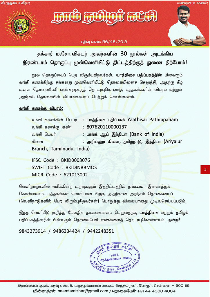 நூல் தொகுப்பைப் பெற விரும்புகிறவர்கள், யாத்திசை பதிப்பகத்தின் பின்வரும் வங்கி கணக்கிற்கு தங்களது முன்வெளியீட்டு தொகையினைச் செலுத்தி, அதற்கு கீழ் உள்ள தொலைபேசி எண்களுக்குத் தொடர்புகொண்டு, புத்தகங்களின் விபரம் மற்றும் அஞ்சல் தொகையின் விபரங்களைப் பெற்றுக் கொள்ளலாம்.
