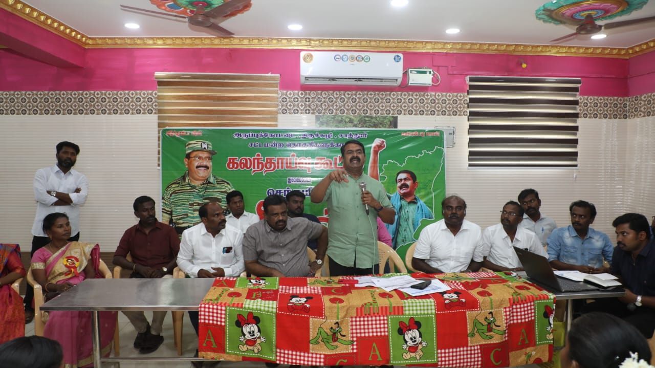 நாம் தமிழர் கட்சியின் உள்கட்டமைப்பை மறுசீராய்வு செய்து, வலிமைப்படுத்தி, எதிர்வரும் தேர்தல்களுக்கு அணியப்படுத்துவதற்காக, தலைமை ஒருங்கிணைப்பாளர் செந்தமிழன் சீமான் அவர்கள் தலைமையில்  22-06-2023 அன்றுஅருப்புகோட்டையில் விருதுநகர் மாவட்டத்திற்குட்பட்ட அருப்புக்கோட்டை, திருச்சுழி மற்றும் சாத்தூர் தொகுதிகளுக்கான கலந்தாய்வு கூட்டம் நடைபெற்றது.