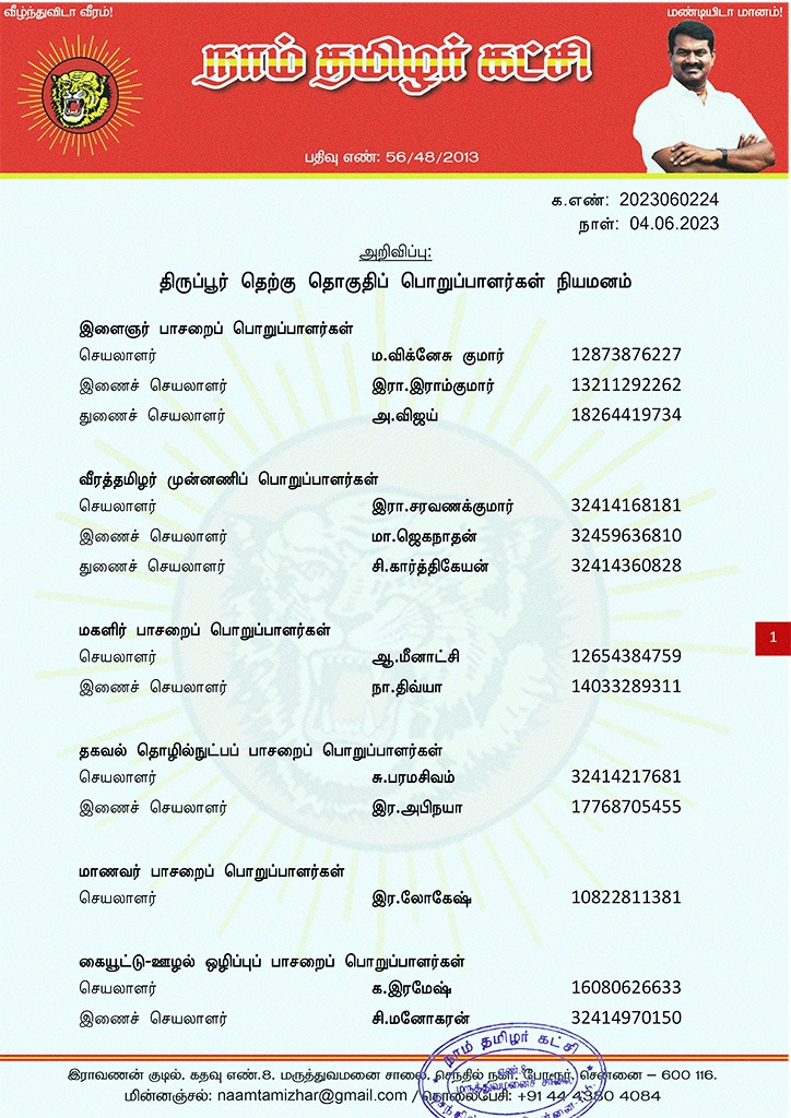 மேற்காண் அனைவரும் நாம் தமிழர் கட்சி – திருப்பூர் தெற்கு தொகுதிப் பொறுப்பாளர்களாக நியமிக்கப்படுகிறார்கள். இவர்கள் அனைவருக்கும், கட்சியின் அனைத்துநிலைப் பொறுப்பாளர்களும், அன்பு உறவுகள் அனைவரும் முழு ஒத்துழைப்பு நல்குமாறு அன்போடு கேட்டுக் கொள்ளப்படுகிறார்கள்.