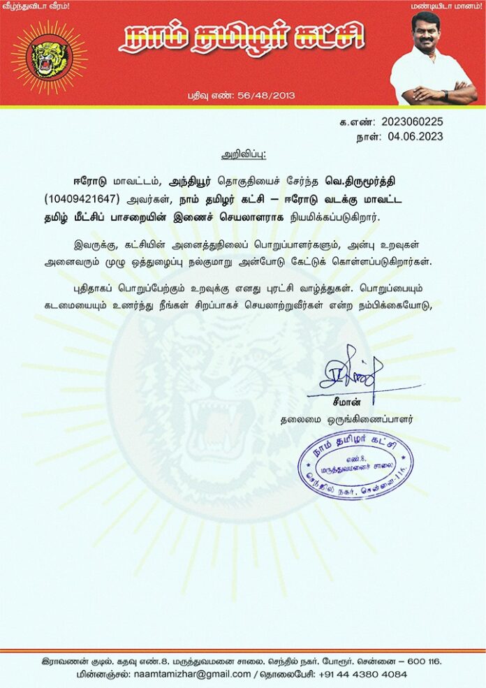ஈரோடு மாவட்டம், அந்தியூர் தொகுதியைச் சேர்ந்த வெ.திருமூர்த்தி (10409421647) அவர்கள், நாம் தமிழர் கட்சி – ஈரோடு வடக்கு மாவட்ட
