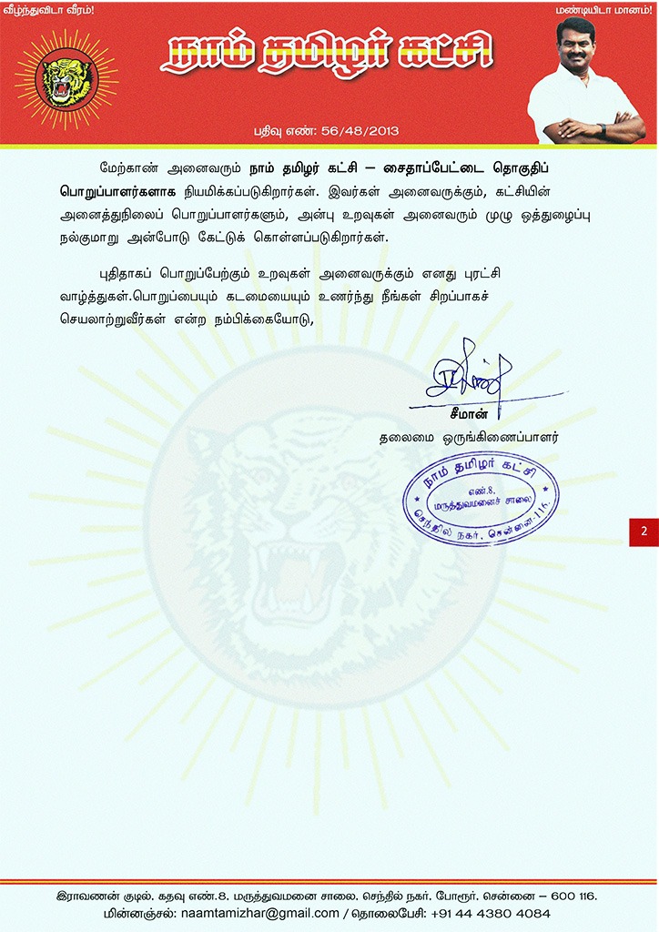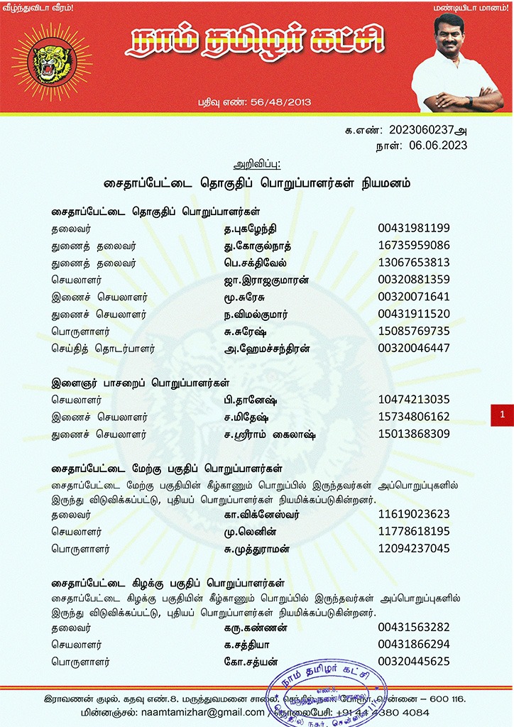 மேற்காண் அனைவரும் நாம் தமிழர் கட்சி – சைதாப்பேட்டை தொகுதிப் பொறுப்பாளர்களாக நியமிக்கப்படுகிறார்கள். இவர்கள் அனைவருக்கும், கட்சியின் அனைத்துநிலைப் பொறுப்பாளர்களும், அன்பு உறவுகள் அனைவரும் முழு ஒத்துழைப்பு நல்குமாறு அன்போடு கேட்டுக் கொள்ளப்படுகிறார்கள்.