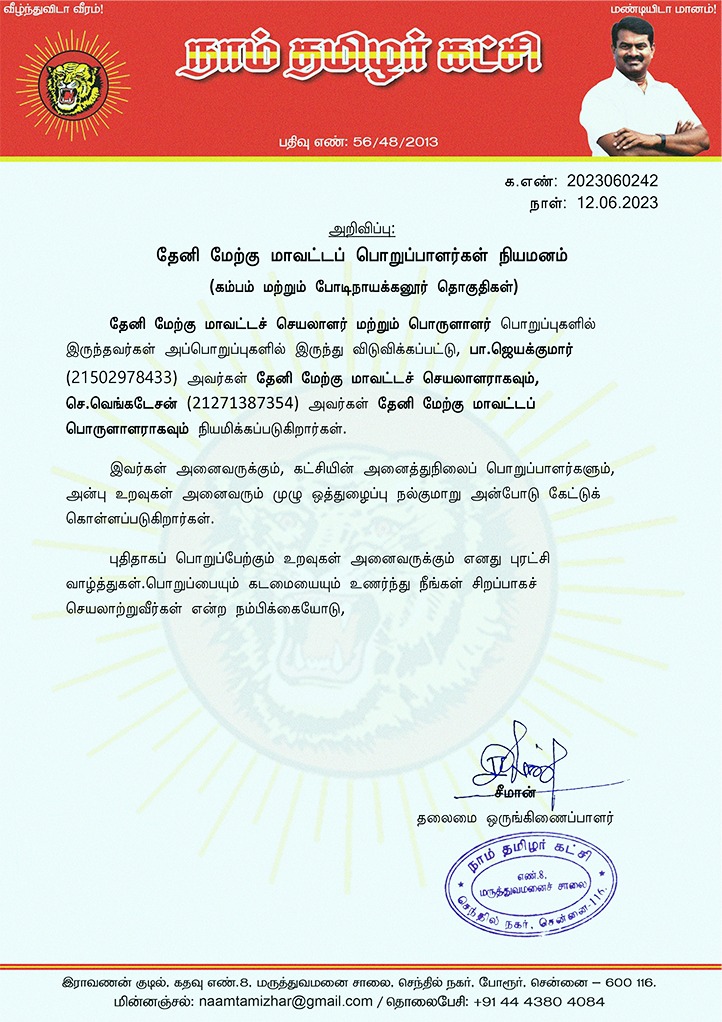 (21271387354) அவர்கள் தேனி மேற்கு மாவட்டப் பொருளாளராகவும் நியமிக்கப்படுகிறார்கள்.