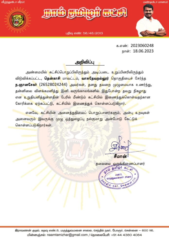அண்மையில் கட்சிப்பொறுப்பிலிருந்தும் அடிப்படை உறுப்பினரிலிருந்தும் விடுவிக்கப்பட்ட, தென்காசி மாவட்டம், வாசுதேவநல்லூர் தொகுதியைச் சேர்ந்த ந.ஞானசேகா் (26528024244) அவர்கள், தனது தவறை முழுமையாக உணர்ந்து, தன்னிலை விளக்கமளித்து இனி வருங்காலங்களில் இதுபோன்ற தவறு நிகழாது என உறுதியளித்துள்ளதின் பேரில் மீண்டும் கட்சியில் இணைந்துக்கொள்வதற்கான கோரிக்கை ஏற்கப்பட்டு, கட்சியில் இணைத்துக் கொள்ளப்படுகிறார்.