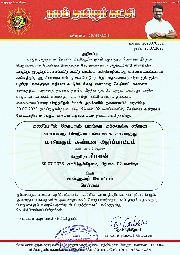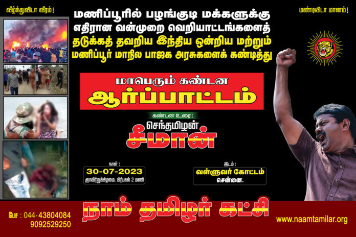 பாஜக ஆளும் மாநிலமான மணிப்பூரில் குக்கி பழங்குடிப் பெண்கள் இருவர் பெரும்பான்மை மெய்தெய் இனத்தைச் சேர்ந்தவர்களால் ஆடையின்றி சாலையில் அடித்து, இழுத்துச்செல்லப்பட்டு கூட்டு பாலியல் வன்கொடுமைக்கு உள்ளாக்கப்பட்டதைக் கண்டித்தும், ஆட்சியாளர்களின் துணையோடு மூன்று மாதங்களாகத் தொடரும் குக்கி பழங்குடி மக்களுக்கு எதிரான கட்டுக்கடங்காத வன்முறை வெறியாட்டங்களைக் கண்டித்தும், அதனைத் தடுக்கத் தவறிய இந்திய ஒன்றிய மற்றும் மணிப்பூர் மாநில பாஜக அரசுகளைக் கண்டித்து, நாம் தமிழர் கட்சி சார்பாக தலைமை ஒருங்கிணைப்பாளர் செந்தமிழன் சீமான் அவர்களின் தலைமையில் வருகின்ற 30-07-2023 ஞாயிற்றுக்கிழமையன்று பிற்பகல் 02 மணியளவில், சென்னை வள்ளுவர் கோட்டத்தில் மாபெரும் கண்டன ஆர்ப்பாட்டம் நடைபெறவிருக்கிறது.