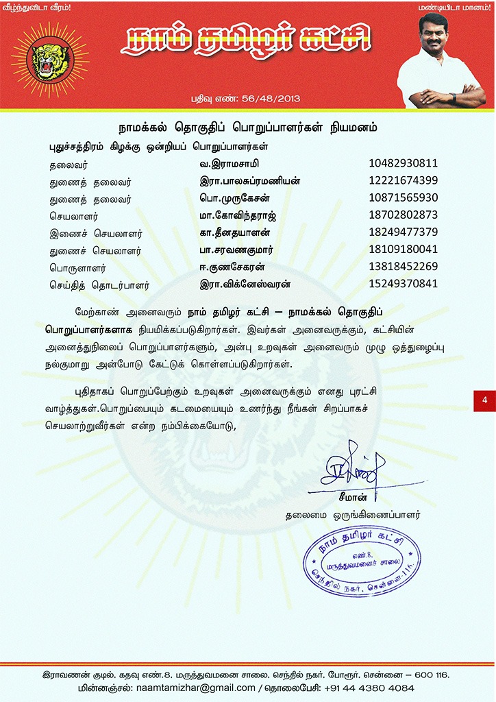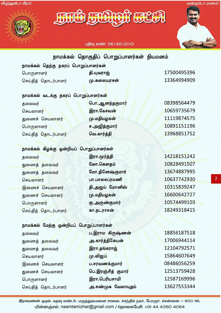 மேற்காண் அனைவரும் நாம் தமிழர் கட்சி – நாமக்கல் தொகுதிப் பொறுப்பாளர்களாக நியமிக்கப்படுகிறார்கள். இவர்கள் அனைவருக்கும், கட்சியின் அனைத்துநிலைப் பொறுப்பாளர்களும், அன்பு உறவுகள் அனைவரும் முழு ஒத்துழைப்பு நல்குமாறு அன்போடு கேட்டுக் கொள்ளப்படுகிறார்கள்.