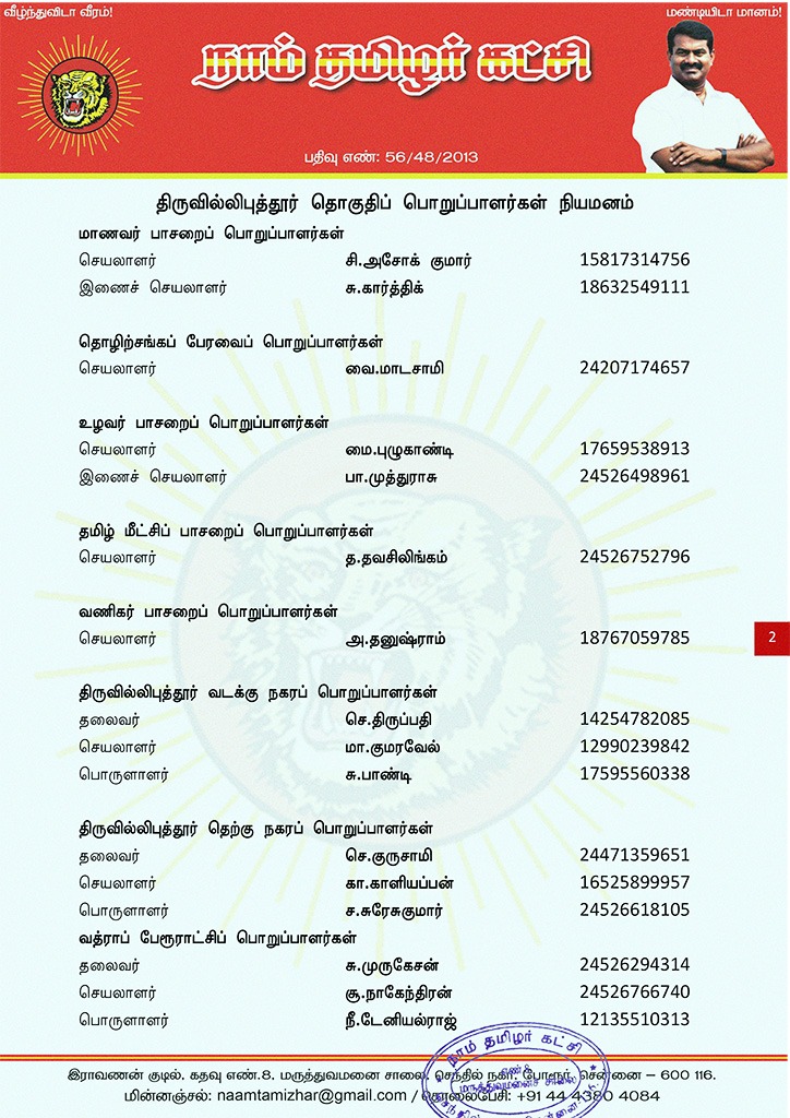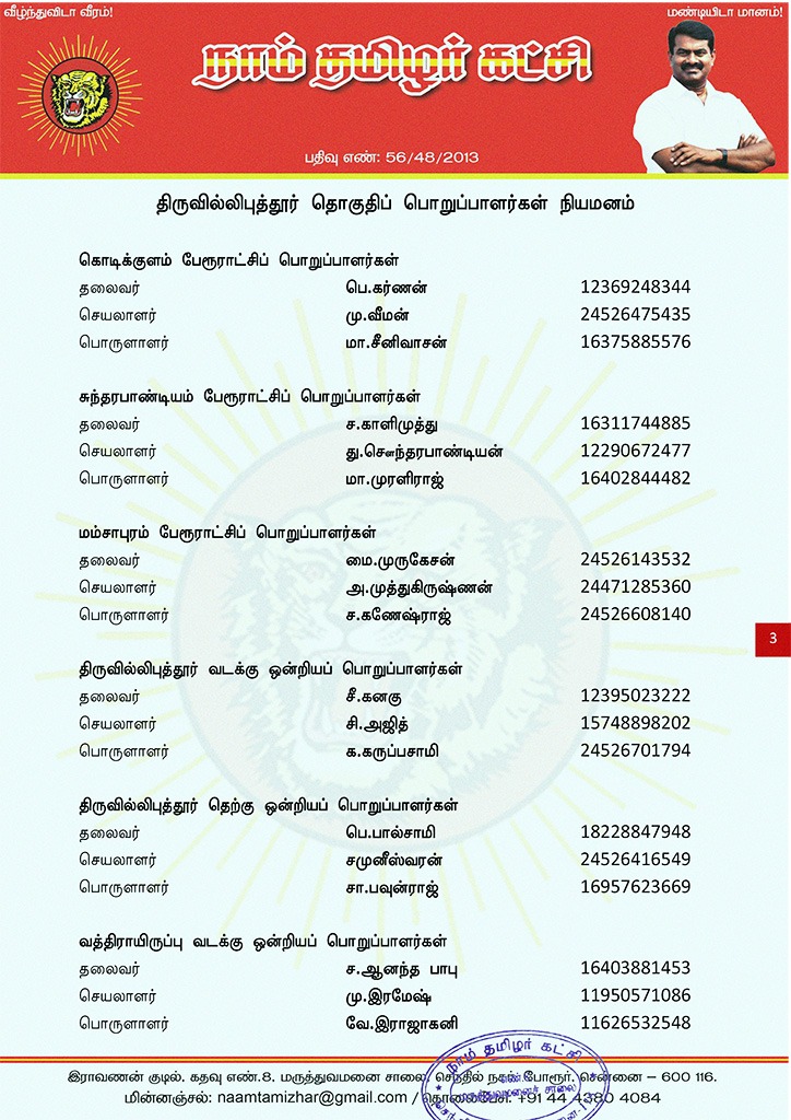 மேற்காண் அனைவரும் நாம் தமிழர் கட்சி – திருவில்லிபுத்தூர் தொகுதிப் பொறுப்பாளர்களாக நியமிக்கப்படுகிறார்கள். இவர்கள் அனைவருக்கும், கட்சியின் அனைத்துநிலைப் பொறுப்பாளர்களும், அன்பு உறவுகள் அனைவரும் முழு ஒத்துழைப்பு நல்குமாறு அன்போடு கேட்டுக் கொள்ளப்படுகிறார்கள்.