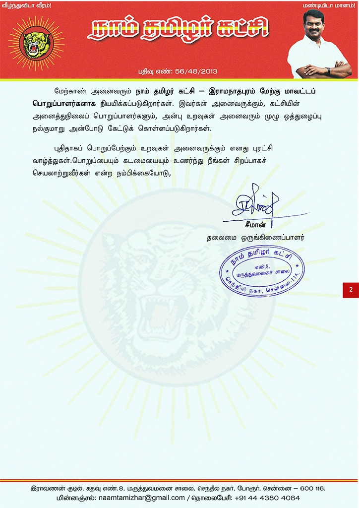 மேற்காண் அனைவரும் நாம் தமிழர் கட்சி – இராமநாதபுரம் மேற்கு மாவட்டப் பொறுப்பாளர்களாக நியமிக்கப்படுகிறார்கள். இவர்கள் அனைவருக்கும், கட்சியின் அனைத்துநிலைப் பொறுப்பாளர்களும், அன்பு உறவுகள் அனைவரும் முழு ஒத்துழைப்பு நல்குமாறு அன்போடு கேட்டுக் கொள்ளப்படுகிறார்கள்.