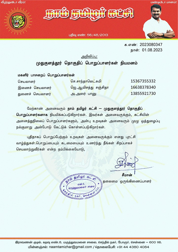 மேற்காண் அனைவரும் நாம் தமிழர் கட்சி – முதுகுளத்தூர் தொகுதிப் பொறுப்பாளர்களாக நியமிக்கப்படுகிறார்கள். இவர்கள் அனைவருக்கும், கட்சியின் அனைத்துநிலைப் பொறுப்பாளர்களும், அன்பு உறவுகள் அனைவரும் முழு ஒத்துழைப்பு நல்குமாறு அன்போடு கேட்டுக் கொள்ளப்படுகிறார்கள்.