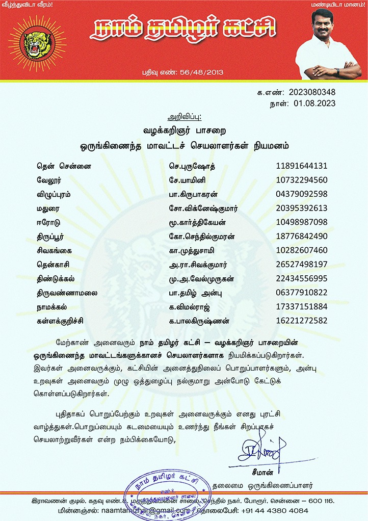மேற்காண் அனைவரும் நாம் தமிழர் கட்சி – வழக்கறிஞர் பாசறையின் ஒருங்கிணைந்த மாவட்டங்களுக்கானச் செயலாளர்களாக நியமிக்கப்படுகிறார்கள். இவர்கள் அனைவருக்கும், கட்சியின் அனைத்துநிலைப் பொறுப்பாளர்களும், அன்பு உறவுகள் அனைவரும் முழு ஒத்துழைப்பு நல்குமாறு அன்போடு கேட்டுக் கொள்ளப்படுகிறார்கள்.