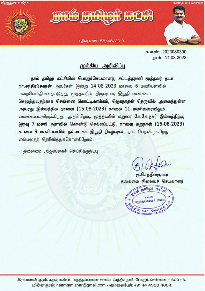 நாம் தமிழர் கட்சியின் பொதுச்செயலாளர், சட்டத்தரணி மூத்தவர் தடா நா.சந்திரசேகரன் அவர்கள் இன்று 14-08-2023 மாலை 6 மணியளவில் மறைவெய்தியதையடுத்து, மூத்தவரின் திருவுடல், இறுதி வணக்கம் செலுத்துவதற்காக சென்னை கொட்டிவாக்கம், ஜெகநாதன் தெருவில் அமைந்துள்ள அவரது இல்லத்தில் நாளை (15-08-2023) காலை 11 மணிவரையிலும் வைக்கப்படவிருக்கிறது. அதன்பிறகு, மூத்தவரின் மதுரை கே.கே.நகர் இல்லத்திற்கு இரவு 7 மணி அளவில் கொண்டு செல்லப்பட்டு, நாளை மறுநாள் (16-08-2023) காலை 9 மணியளவில் நல்லடக்க இறுதி நிகழ்வுகள் நடைபெறவிருக்கிறது என்பதைத் தெரிவித்துக்கொள்கிறோம்.