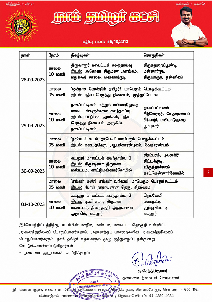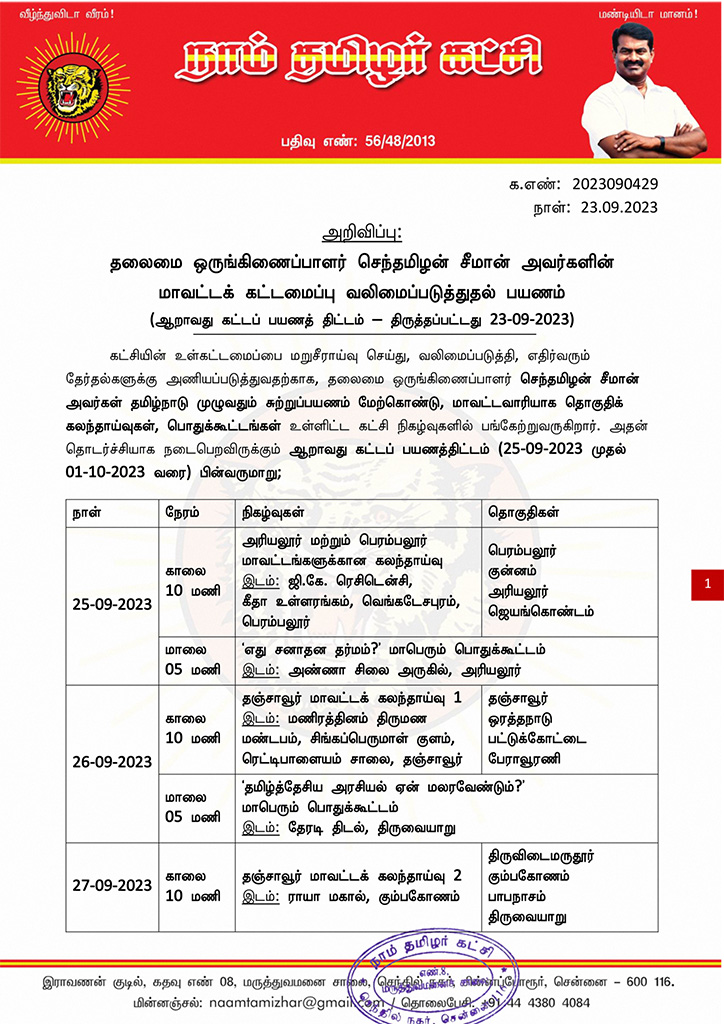 கட்சியின் உள்கட்டமைப்பை மறுசீராய்வு செய்து, வலிமைப்படுத்தி, எதிர்வரும் தேர்தல்களுக்கு அணியப்படுத்துவதற்காக, தலைமை ஒருங்கிணைப்பாளர் செந்தமிழன் சீமான் அவர்கள் தமிழ்நாடு முழுவதும் சுற்றுப்பயணம் மேற்கொண்டு, மாவட்டவாரியாக தொகுதிக் கலந்தாய்வுகள், பொதுக்கூட்டங்கள் உள்ளிட்ட கட்சி நிகழ்வுகளில் பங்கேற்றுவருகிறார். அதன் தொடர்ச்சியாக நடைபெறவிருக்கும் ஆறாவது கட்டப் பயணத்திட்டம் (25-09-2023 முதல்