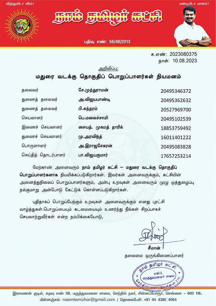 மேற்காண் அனைவரும் நாம் தமிழர் கட்சி – மதுரை வடக்கு தொகுதிப் பொறுப்பாளர்களாக நியமிக்கப்படுகிறார்கள். இவர்கள் அனைவருக்கும், கட்சியின் அனைத்துநிலைப் பொறுப்பாளர்களும், அன்பு உறவுகள் அனைவரும் முழு ஒத்துழைப்பு நல்குமாறு அன்போடு கேட்டுக் கொள்ளப்படுகிறார்கள்.