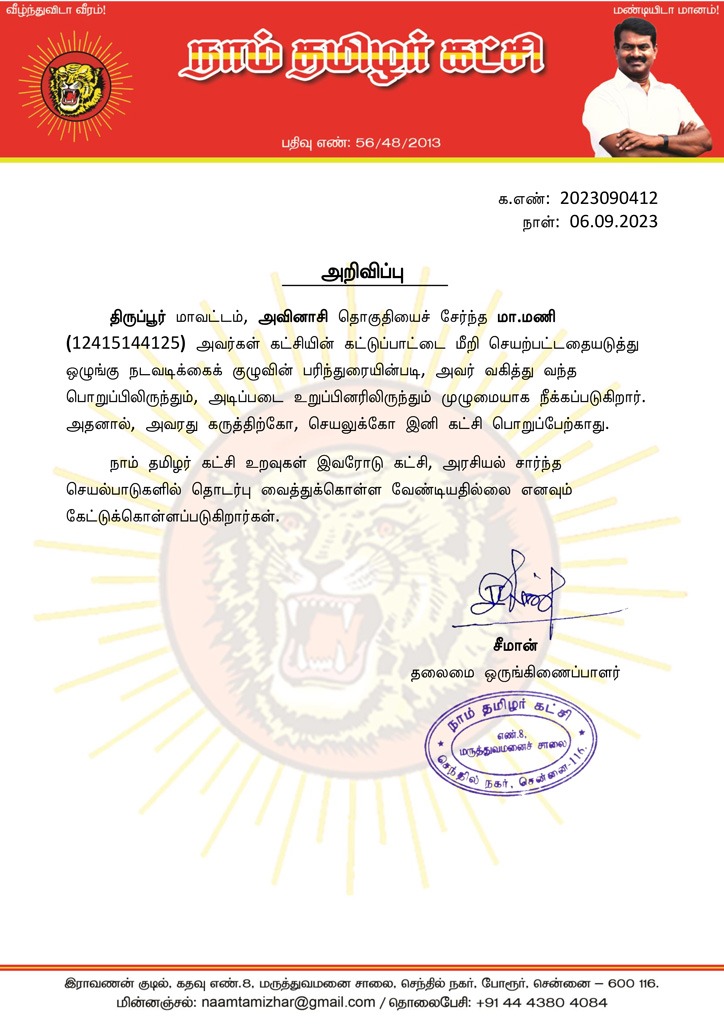 திருப்பூர் மாவட்டம், அவினாசி தொகுதியைச் சேர்ந்த மா.மணி (12415144125) அவர்கள் கட்சியின் கட்டுப்பாட்டை மீறி செயற்பட்டதையடுத்து ஒழுங்கு நடவடிக்கைக் குழுவின் பரிந்துரையின்படி, அவர் வகித்து வந்த பொறுப்பிலிருந்தும், அடிப்படை உறுப்பினரிலிருந்தும் முழுமையாக நீக்கப்படுகிறார். அதனால், அவரது கருத்திற்கோ, செயலுக்கோ இனி கட்சி பொறுப்பேற்காது.