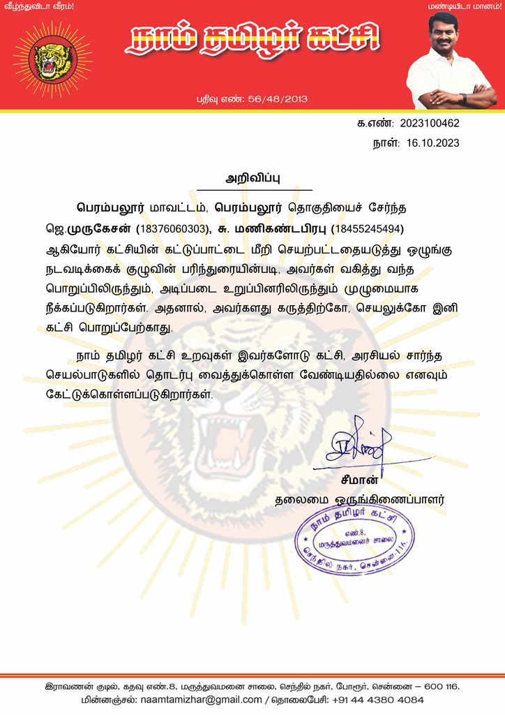 பெரம்பலூர் மாவட்டம், பெரம்பலூர் தொகுதியைச் சேர்ந்த ஜெ.முருகேசன் (18376060303), சு. மணிகண்டபிரபு (18455245494) ஆகியோர் கட்சியின் கட்டுப்பாட்டை மீறி செயற்பட்டதையடுத்து ஒழுங்கு நடவடிக்கைக் குழுவின் பரிந்துரையின்படி, அவர்கள் வகித்து வந்த பொறுப்பிலிருந்தும், அடிப்படை உறுப்பினரிலிருந்தும் முழுமையாக நீக்கப்படுகிறார்கள். அதனால், அவர்களது கருத்திற்கோ, செயலுக்கோ இனி கட்சி பொறுப்பேற்காது.