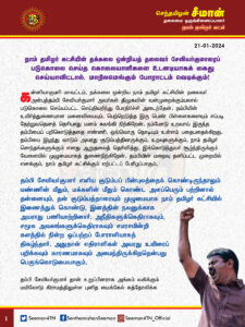 பதினான்கு ஆண்டுகாலப் பயணத்தில் நாம் தமிழர் எனும் பெரும் படையைப் பொறுப்புணர்வுடன் கூடியக் கட்டுப்பாடோடும், மிகுந்தக் கட்டுக்கோப்போடும் வழிநடத்தி வருகிறேன். தமிழர்களது உரிமைகள் பறிக்கப்படும்போதும், அண்டை மாநிலங்களில் தமிழர்கள் இனவெறி கொண்டு தாக்கப்படும்போதும், அடக்குமுறைகள் ஏவப்படும்போதும், சனநாயக வழிமுறைகளையும், அறம்சார்ந்த போராட்ட வடிவத்தையுமே முன்மொழிந்திருக்கிறேன். இலக்கு நோக்கியப் பயணத்தில் கவனம் சிதறிவிடக்கூடாதெனும் ஒற்றை நோக்கமே என்னையும், எனது பிள்ளைகளையும் மிகுந்த சனநாயகவாதிகளாக இருக்கச் செய்கிறது. ஆனால், நாங்கள் சனநாயகவாதிகளாக இருப்பதையே தங்களுக்குச் சாதகமாக்கிக் கொண்டு, எங்கள் பிள்ளைகள் மீது கொடுந்தாக்குதல்களையும், வன்முறை வெறியாட்டங்களையும் ஏவிவிட்டால், அதற்குப் பணிந்துபோகிறவர்கள் நாங்கள் இல்லை. ‘துன்பத்தை அதைத் தந்தவனுக்கே திருப்பிக் கொடு’ என்பதுதான் எங்கள் தலைவர் மேதகு வே.பிரபாகரன் அவர்கள் எங்களுக்குப் கற்பித்தப்பாடம். எங்கள் பொறுமைக்கும், சகிப்புத்தன்மைக்கும் ஒரு எல்லை உண்டு. எங்கள் குடும்பத்தில் மிகப்பெரிய இழப்பு நேர்ந்திருக்கிறது. தம்பி சேவியர்குமாரை இழந்து பரிதவித்து நிற்கிறோம். எங்களது சனநாயக உணர்வையும், அரசியல்ரீதியிலான அணுகுமுறையையும் ஒருநாளும் குறைத்து மதிப்பிட வேண்டாம். அவ்வாறு மதிப்பிட்டால், அது பெரும் எதிர்விளைவுகளை ஏற்படுத்தும்.