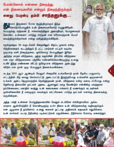 நம் தாய் நிலமான தமிழீழத்தில் உனது உடல் விதைக்கப்படும் நிலத்தில் முளைக்கும் பனையில் மலரும் பனம்பூவின் வாசமாய், என் சுவாசமாய் என்றும் நீ என்னுள் இருப்பாய். விடுதலை பெற்ற பின்னும் உன்னோடு சிறப்புமுகாம் என்ற சித்திரவதை முகாமில் இருந்த மற்ற மூவருக்கான விடுதலைக்கு போராடுவேன் என்று உறுதி ஏற்கிறேன்.
