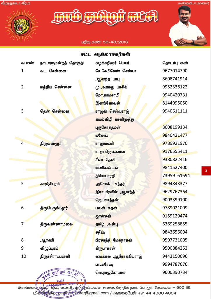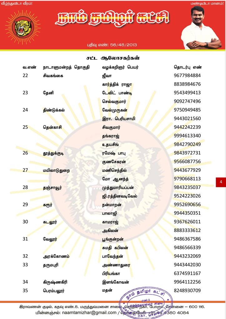 மேற்காணும் சட்ட ஆலோசகர்கள், வேட்பாளர் மற்றும் தேர்தல் பணிக்குழுவுடன் ஒருங்கிணைந்து செயல்பட வேண்டும் எனவும், சட்ட ஆலோசகர்களுக்கு கட்சியின் அனைத்துநிலைப் பொறுப்பாளர்களும், அன்பு உறவுகள் அனைவரும் முழு ஒத்துழைப்பு நல்குமாறும் அன்போடு கேட்டுக் கொள்ளப்படுகிறார்கள்.
