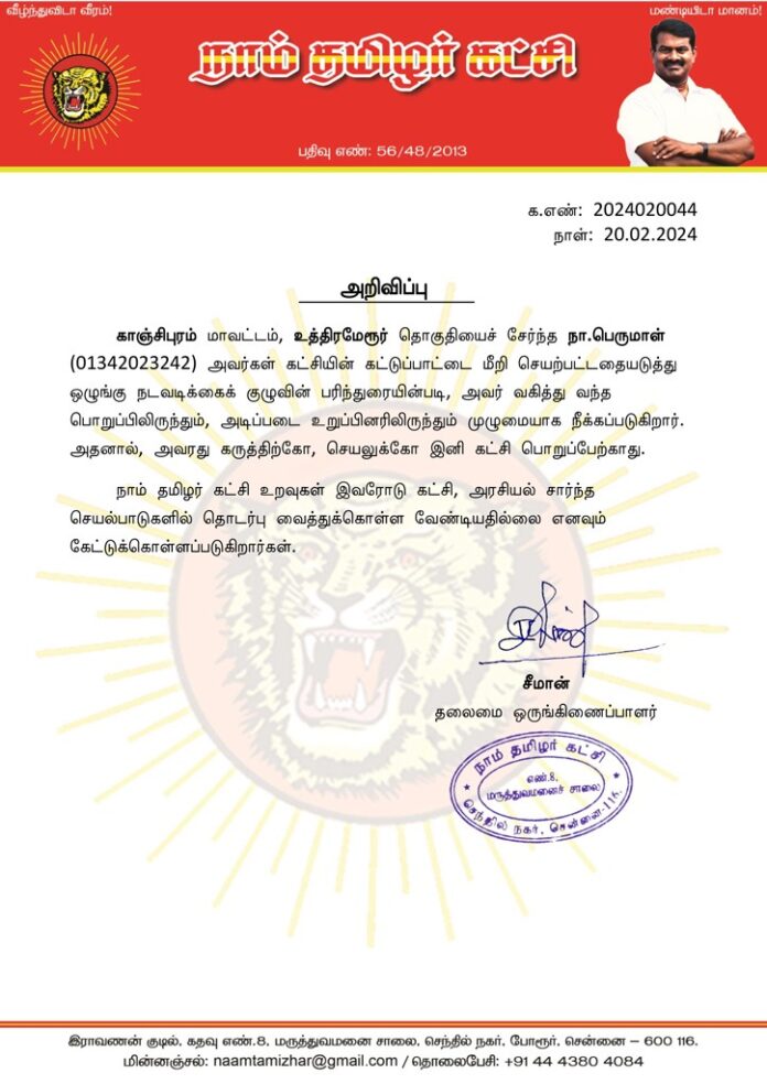 காஞ்சிபுரம் மாவட்டம், உத்திரமேரூர் தொகுதியைச் சேர்ந்த நா.பெருமாள் (01342023242) அவர்கள் கட்சியின் கட்டுப்பாட்டை மீறி செயற்பட்டதையடுத்து ஒழுங்கு நடவடிக்கைக் குழுவின் பரிந்துரையின்படி, அவர் வகித்து வந்த பொறுப்பிலிருந்தும், அடிப்படை உறுப்பினரிலிருந்தும் முழுமையாக நீக்கப்படுகிறார். அதனால், அவரது கருத்திற்கோ, செயலுக்கோ இனி கட்சி பொறுப்பேற்காது.