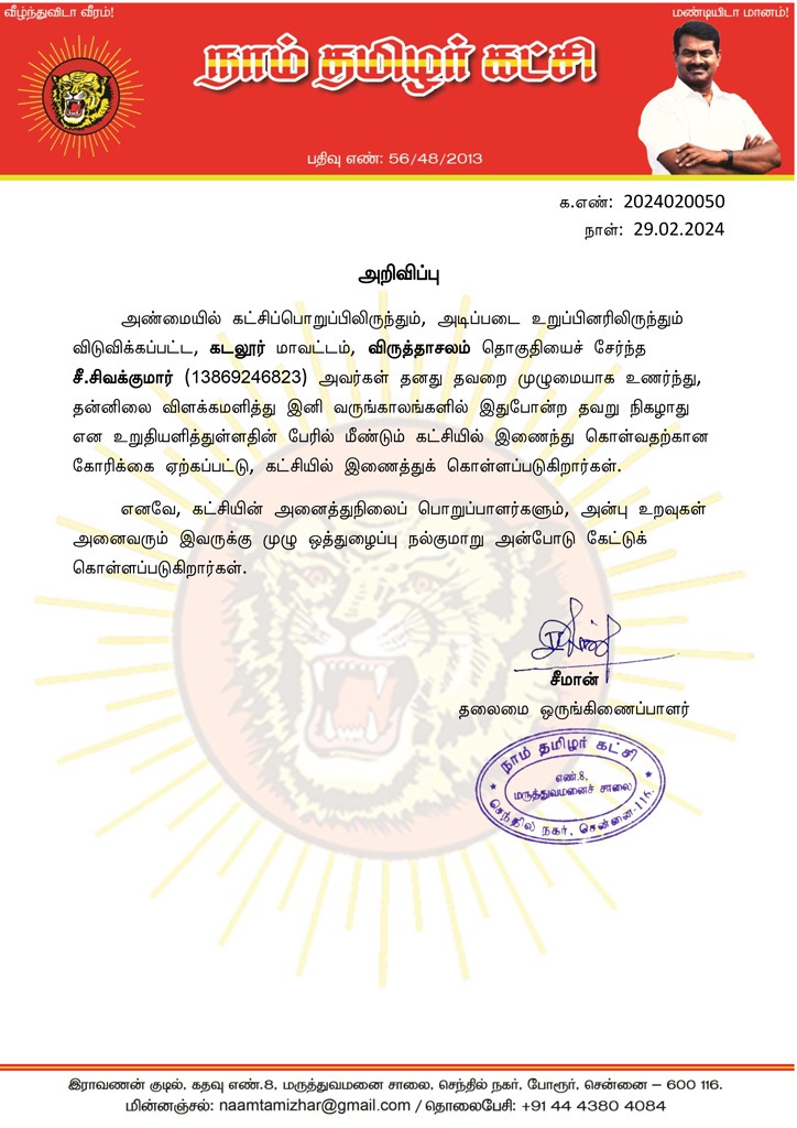 அண்மையில் கட்சிப்பொறுப்பிலிருந்தும், அடிப்படை உறுப்பினரிலிருந்தும் விடுவிக்கப்பட்ட, கடலூர் மாவட்டம், விருத்தாசலம் தொகுதியைச் சேர்ந்த சீ.சிவக்குமார் (13869246823) அவர்கள் தனது தவறை முழுமையாக உணர்ந்து, தன்னிலை விளக்கமளித்து இனி வருங்காலங்களில் இதுபோன்ற தவறு நிகழாது என உறுதியளித்துள்ளதின் பேரில் மீண்டும் கட்சியில் இணைந்து கொள்வதற்கான கோரிக்கை ஏற்கப்பட்டு, கட்சியில் இணைத்துக் கொள்ளப்படுகிறார்கள்.