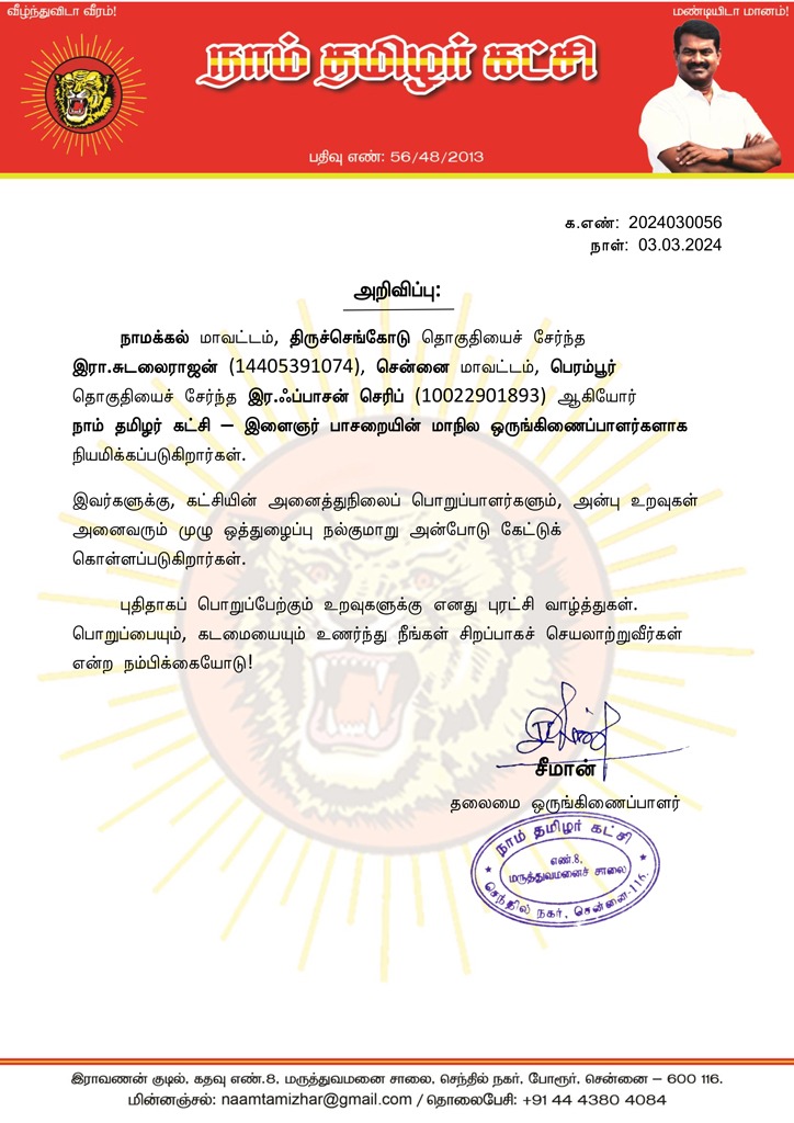 நாம் தமிழர் கட்சி – இளைஞர் பாசறையின் மாநில ஒருங்கிணைப்பாளர்களாக நியமிக்கப்படுகிறார்கள்.
