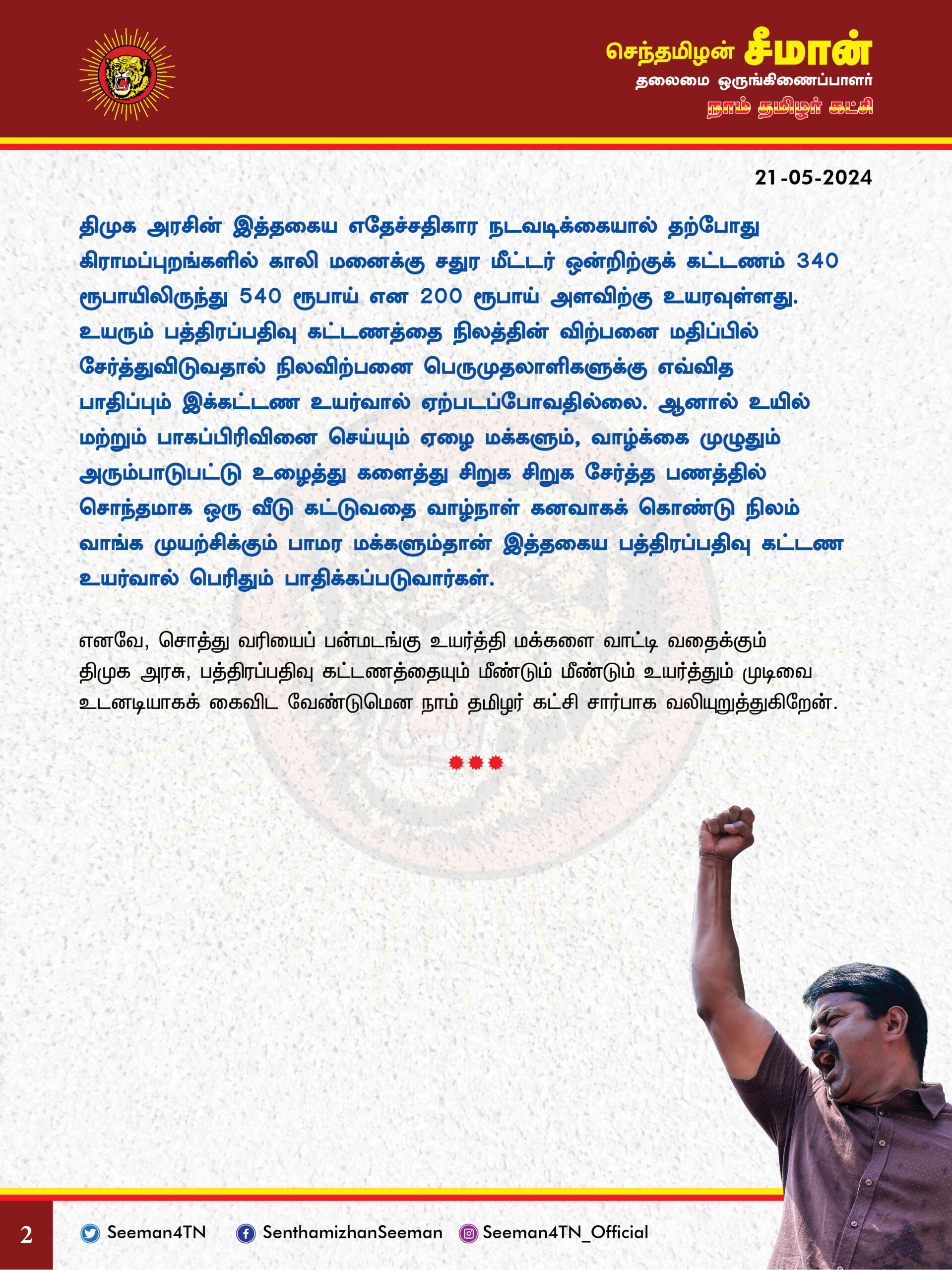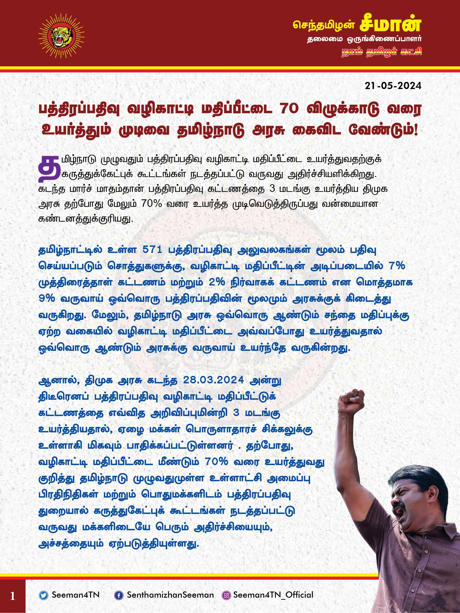எனவே, சொத்து வரியைப் பன்மடங்கு உயர்த்தி மக்களை வாட்டி வதைக்கும் திமுக அரசு, பத்திரப்பதிவு கட்டணத்தையும் மீண்டும் மீண்டும் உயர்த்தும் முடிவை உடனடியாகக் கைவிட வேண்டுமென நாம் தமிழர் கட்சி சார்பாக வலியுறுத்துகிறேன்.