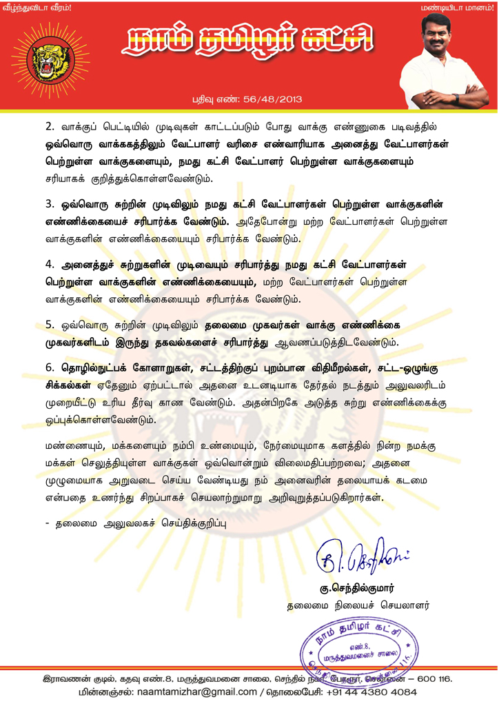மண்ணையும், மக்களையும் நம்பி உண்மையும், நேர்மையுமாக களத்தில் நின்ற நமக்கு மக்கள் செலுத்தியுள்ள வாக்குகள் ஒவ்வொன்றும் விலைமதிப்பற்றவை; அதனை முழுமையாக அறுவடை செய்ய வேண்டியது நம் அனைவரின் தலையாயக் கடமை என்பதை உணர்ந்து சிறப்பாகச் செயலாற்றுமாறு அறிவுறுத்தப்படுகிறார்கள்.