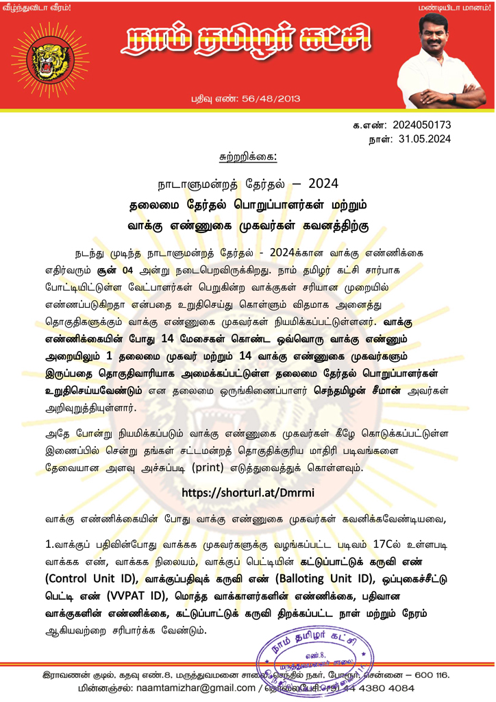நடந்து முடிந்த நாடாளுமன்றத் தேர்தல் – 2024க்கான வாக்கு எண்ணிக்கை எதிர்வரும் சூன் 04 அன்று நடைபெறவிருக்கிறது. நாம் தமிழர் கட்சி சார்பாக போட்டியிட்டுள்ள வேட்பாளர்கள் பெறுகின்ற வாக்குகள் சரியான முறையில் எண்ணப்படுகிறதா என்பதை உறுதிசெய்து கொள்ளும் விதமாக அனைத்து தொகுதிகளுக்கும் வாக்கு எண்ணுகை முகவர்கள் நியமிக்கப்பட்டுள்ளனர். வாக்கு எண்ணிக்கையின் போது 14 மேசைகள் கொண்ட ஒவ்வொரு வாக்கு எண்ணும் அறையிலும் 1 தலைமை முகவர் மற்றும் 14 வாக்கு எண்ணுகை முகவர்களும் இருப்பதை தொகுதிவாரியாக அமைக்கப்பட்டுள்ள தலைமை தேர்தல் பொறுப்பாளர்கள் உறுதிசெய்யவேண்டும் என தலைமை ஒருங்கிணைப்பாளர் செந்தமிழன் சீமான் அவர்கள் அறிவுறுத்தியுள்ளார்.
