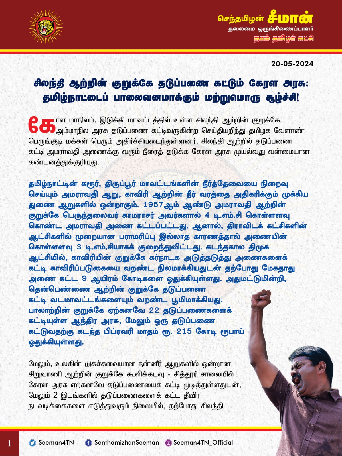 ஆகவே, சிலந்தி மற்றும் சிறுவாணி நதிகளின் குறுக்கே தடுப்பணைகளைக் கட்டி தமிழ்நாட்டைப் பாலைவனமாக்கும் கேரள அரசின் எதேச்சதிகாரப்போக்கிற்கு எதிராக உச்சநீதிமன்றத்தில் உடனடியாக வழக்கு தொடர்ந்து, சமரசமற்ற சட்டப்போராட்டம் நடத்தி தமிழர்களின் நதிநீர் உரிமை பறிபோகாமல் பாதுகாக்க வேண்டுமெனத் தமிழ்நாடு அரசினை நாம் தமிழர் கட்சி சார்பாக வலியுறுத்துகிறேன்.