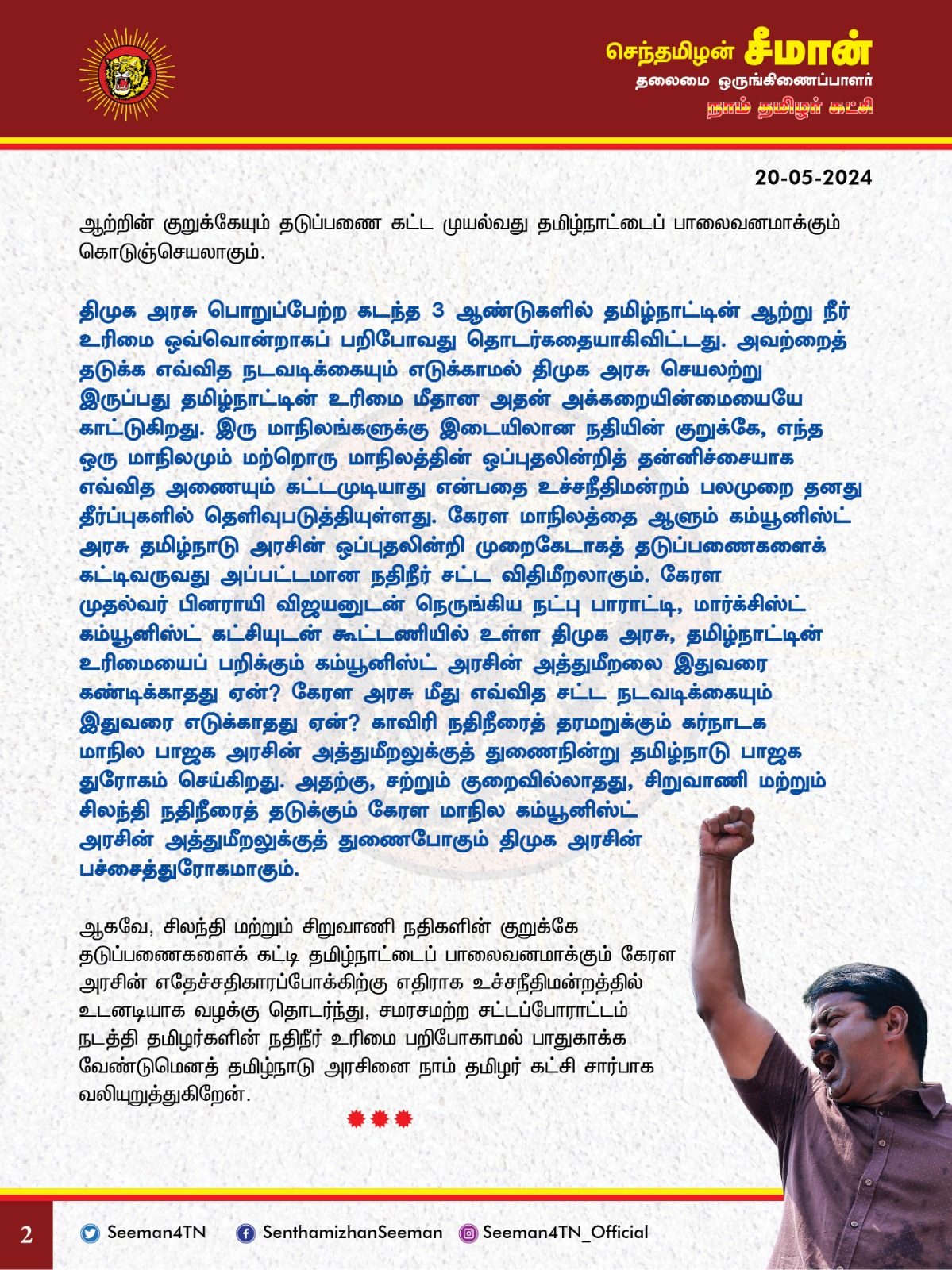 கேரள முதல்வர் பினராயி விஜயனுடன் நெருங்கிய நட்பு பாராட்டி, மார்க்சிஸ்ட் கம்யூனிஸ்ட் கட்சியுடன் கூட்டணியில் உள்ள திமுக அரசு, தமிழ்நாட்டின் உரிமையைப் பறிக்கும் கம்யூனிஸ்ட் அரசின் அத்துமீறலை இதுவரை கண்டிக்காதது ஏன்? கேரள அரசு மீது எவ்வித சட்ட நடவடிக்கையும் இதுவரை எடுக்காதது ஏன்? காவிரி நதிநீரைத் தரமறுக்கும் கர்நாடக மாநில பாஜக அரசின் அத்துமீறலுக்குத் துணைநின்று தமிழ்நாடு பாஜக துரோகம் செய்கிறது. அதற்கு, சற்றும் குறைவில்லாதது, சிறுவாணி மற்றும் சிலந்தி நதிநீரைத் தடுக்கும் கேரள மாநில கம்யூனிஸ்ட் அரசின் அத்துமீறலுக்குத் துணைபோகும் திமுக அரசின் பச்சைத்துரோகமாகும்.