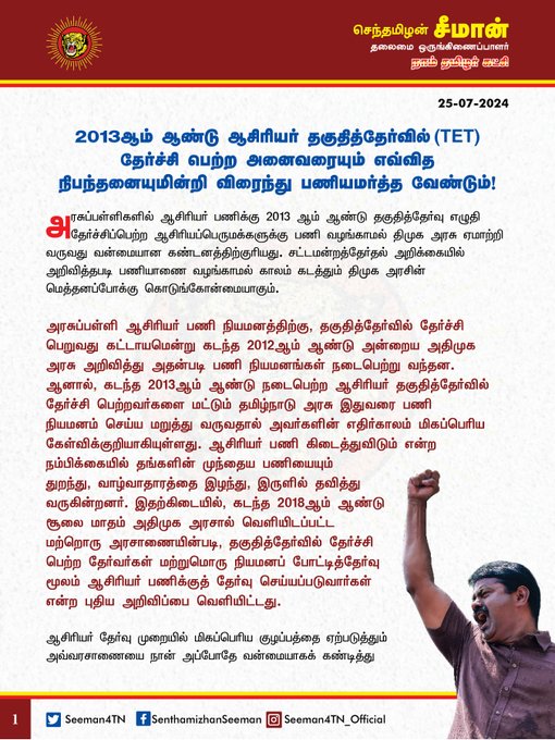 ஆகவே, தமிழ்நாடு அரசு உயர்நீதிமன்றத் தீர்ப்பினையே முன் மாதிரியாக கொண்டு, தேர்தல் அறிக்கையில் உறுதியளித்தபடி 2013ஆம் ஆண்டுமுதல் ஆசிரியர் தகுதித்தேர்வில் தேர்ச்சி பெற்ற ஆசிரியர் பெருமக்கள் அனைவரையும் பணி நியமனம் செய்வதற்கான அரசாணையை விரைந்து வெளியிட வேண்டுமென நாம் தமிழர் கட்சி சார்பாக வலியுறுத்துகிறேன்.
