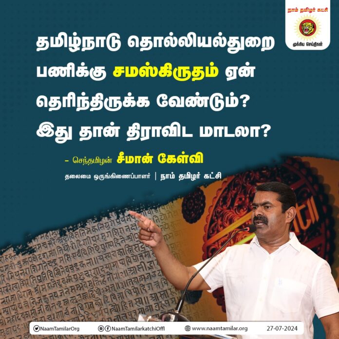 தமிழ்நாடு தொல்லியல்துறை பணிக்கு சமஸ்கிருதம் ஏன் தெரிந்திருக்க வேண்டும்? இது தான் திராவிட மாடலா? – சீமான் கேள்வி