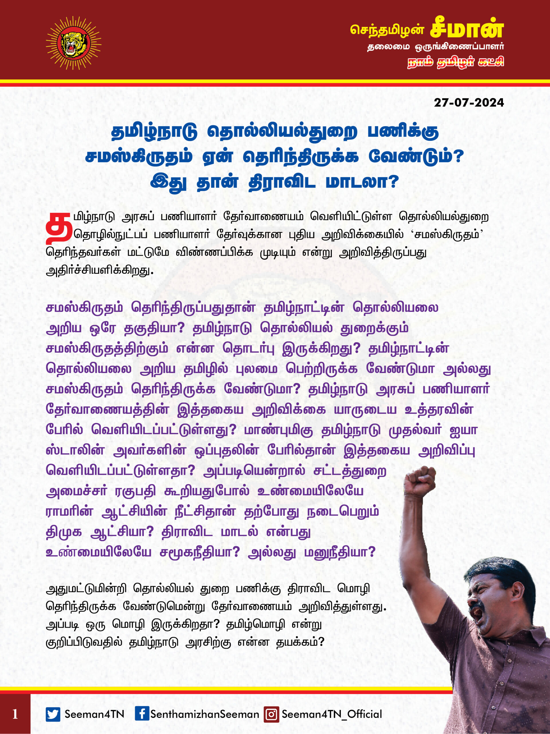 ஆகவே, தமிழ்நாடு தொல்லியல்துறை பணிக்கு சமஸ்கிருதம் கட்டாயம் தெரிந்திருக்க வேண்டும் என்ற அறிவிக்கையை உடனடியாகத் திரும்பப்பெற்று, தமிழில் புலமை பெற்றிருக்க வேண்டுமென்ற அறிவிப்பை தமிழ்நாடு அரசு வெளியிட வேண்டுமென நாம் தமிழர் கட்சி சார்பாக வலியுறுத்துகிறேன்.