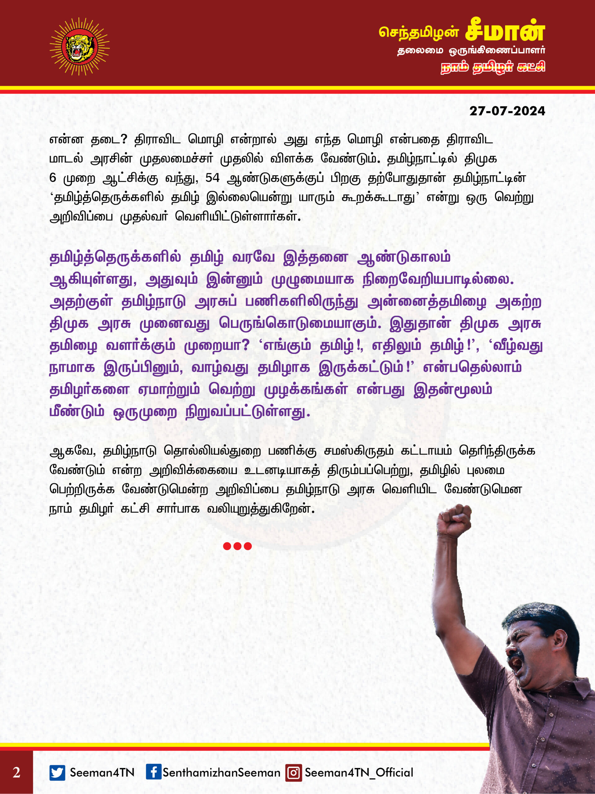 அதுமட்டுமின்றி தொல்லியல் பணிக்கு திராவிட மொழி தெரிந்திருக்க வேண்டுமென்று தேர்வாணையம் அறிவித்துள்ளது. அப்படி ஒரு மொழி இருக்கிறதா? தமிழ்மொழி என்று குறிப்பிடுவதில் தமிழ்நாடு அரசிற்கு என்ன தயக்கம்? என்ன தடை? திராவிட மொழி என்றால் அது எந்த மொழி என்பதை திராவிட மாடல் அரசின் முதலமைச்சர் முதலில் விளக்க வேண்டும். தமிழ்நாட்டில் திமுக 6 முறை ஆட்சிக்கு வந்து, 54 ஆண்டுகளுக்குப் பிறகு தற்போதுதான் தமிழ்நாட்டின் ‘தமிழ்த்தெருக்களில் தமிழ் இல்லையென்று யாரும் கூறக்கூடாது’ என்று ஒரு வெற்று அறிவிப்பை முதல்வர் வெளியிட்டுள்ளார்கள். தமிழ்த்தெருக்களில் தமிழ் வரவே இத்தனை ஆண்டுகாலம் ஆகியுள்ளது, அதுவும் இன்னும் முழுமையாக நிறைவேறியபாடில்லை. அதற்குள் தமிழ்நாடு அரசுப் பணிகளிலிருந்து அன்னைத்தமிழை அகற்ற திமுக அரசு முனைவது பெருங்கொடுமையாகும். இதுதான் திமுக அரசு தமிழை வளர்க்கும் முறையா? ‘எங்கும் தமிழ்! எதிலும் தமிழ்!’, ‘வீழ்வது நாமாக இருப்பினும், வாழ்வது தமிழாக இருக்கட்டும்!’ என்பதெல்லாம் தமிழர்களை ஏமாற்றும் வெற்று முழக்கங்கள் என்பது இதன்மூலம் மீண்டும் ஒருமுறை நிறுவப்பட்டுள்ளது.