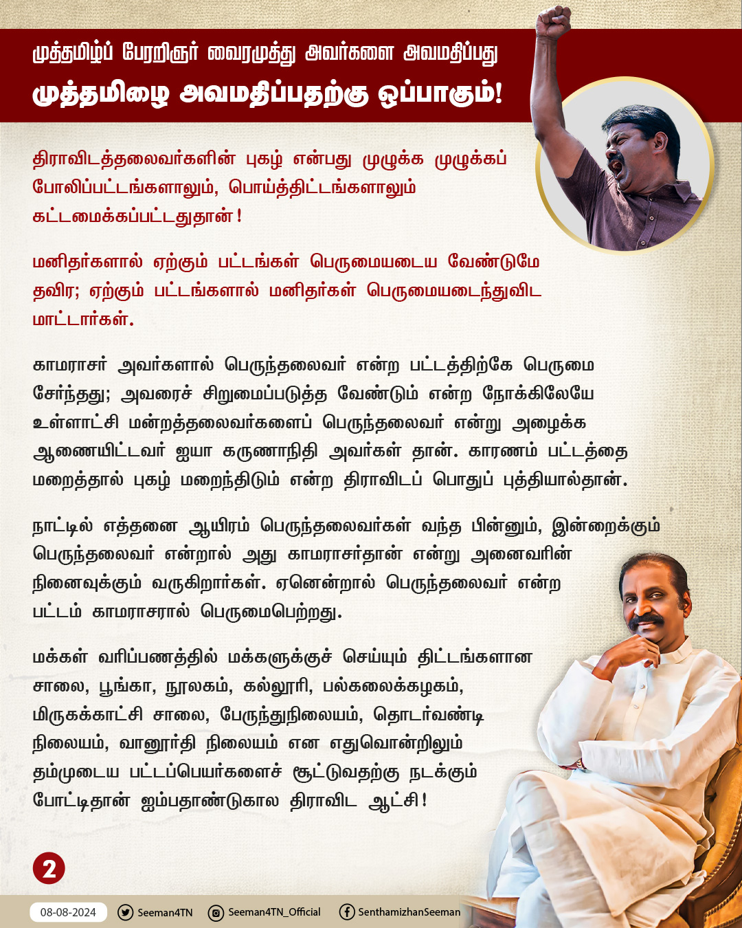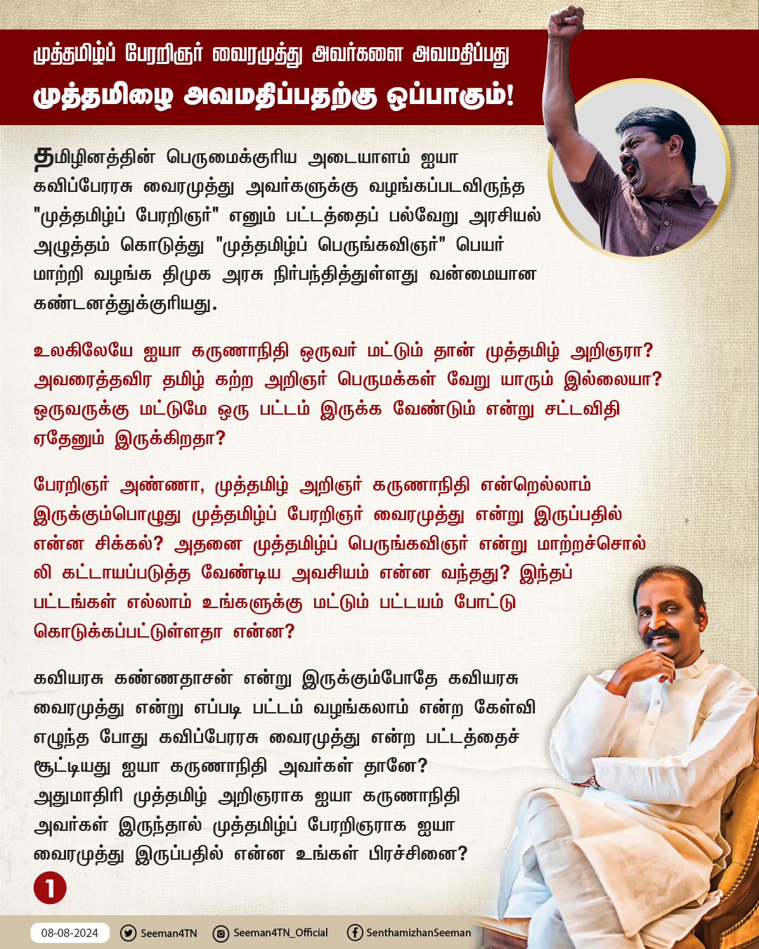 தமிழினத்தின் பெருமைக்குரிய அடையாளம் ஐயா கவிப்பேரரசு வைரமுத்து அவர்களுக்கு வழங்கப்படவிருந்த “முத்தமிழ்ப் பேரறிஞர்” எனும் பட்டத்தைப் பல்வேறு அரசியல் அழுத்தம் கொடுத்து “முத்தமிழ்ப் பெருங்கவிஞர்” பெயர் மாற்றி வழங்க திமுக அரசு நிர்பந்தித்துள்ளது வன்மையான கண்டனத்துக்குரியது.