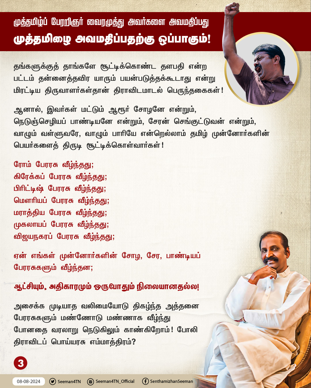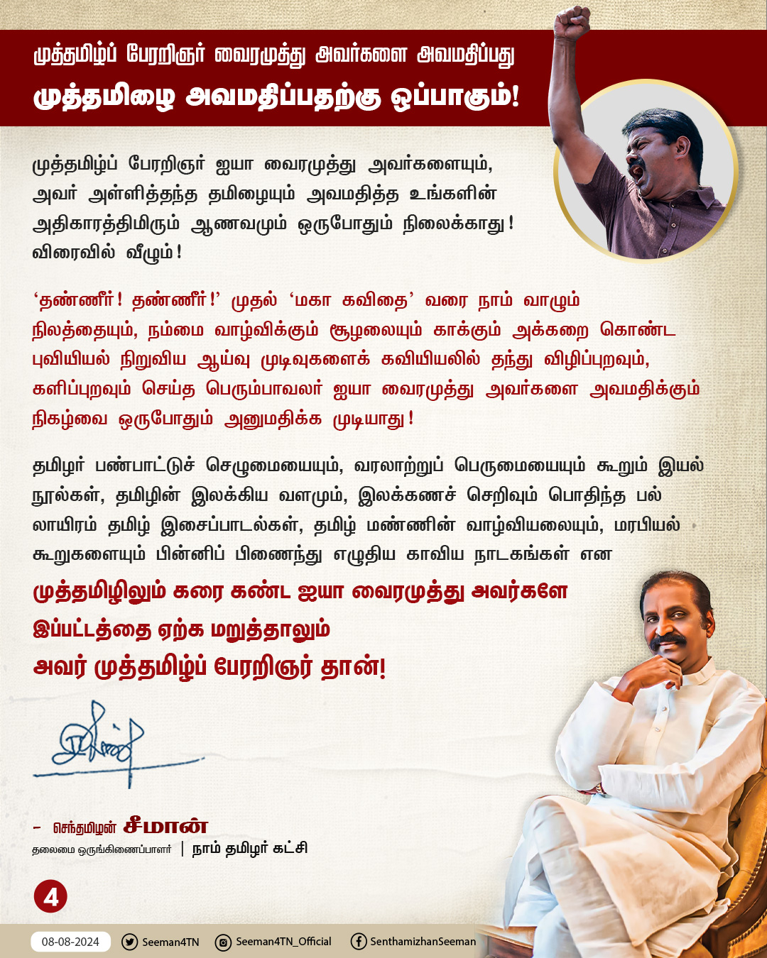 முத்தமிழ்ப் பேரறிஞர் ஐயா வைரமுத்து அவர்களையும், அவர் அள்ளித்தந்த தமிழையும் அவமதித்த உங்களின் அதிகாரத்திமிரும் ஆணவமும் ஒருபோதும் நிலைக்காது! விரைவில் வீழும்!