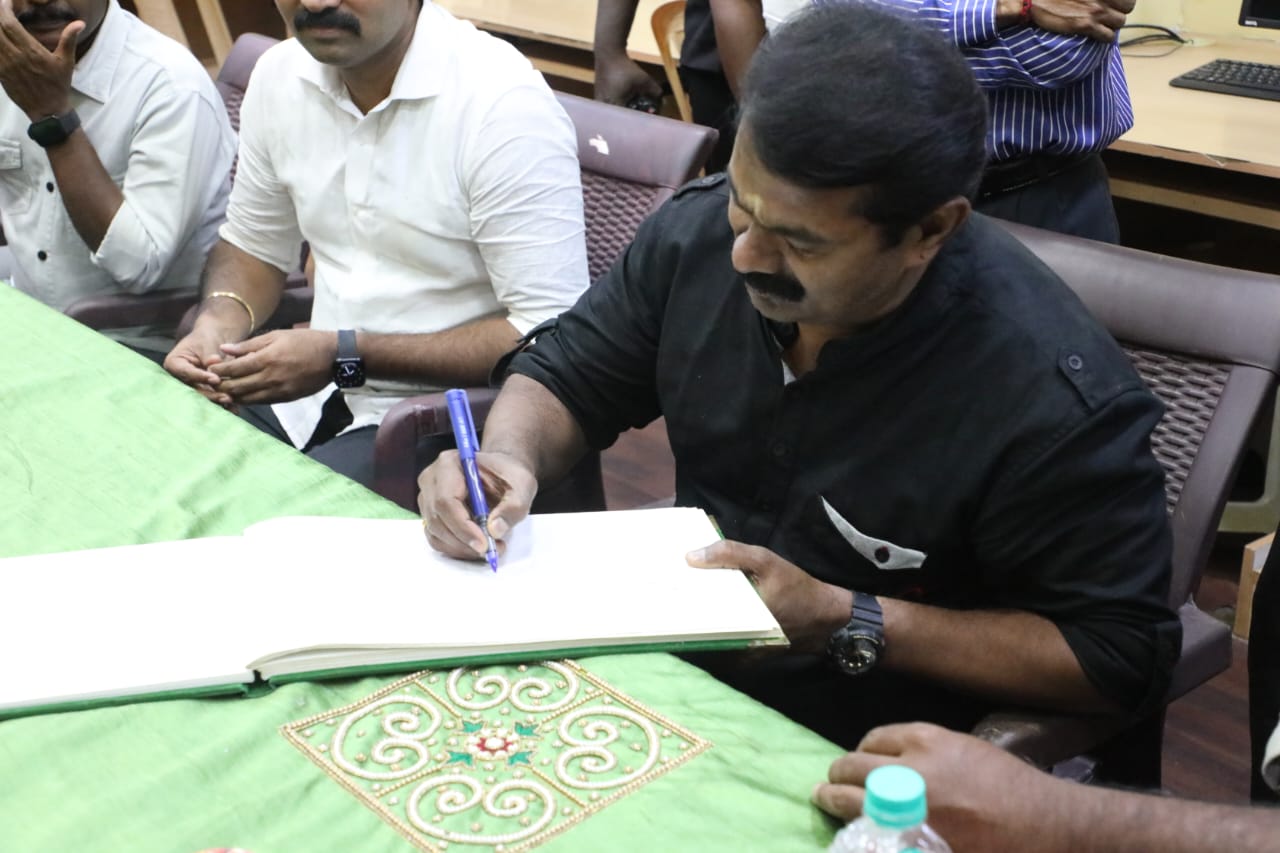 தொடர்ந்து பள்ளி வளாகத்தில் வைக்கப்பட்டிருந்த வருகை பதிவேட்டில் சீமான் கையோப்பமிட்டு பள்ளி தலைமை ஆசிரியரிடம் சிறிது நேரம் பாரதி பணியாற்றிய இந்த சேதுபதி மேல்நிலைப் பள்ளியின் நினைவுகள் குறித்த விவரங்களைக் கேட்டறிந்தார்.