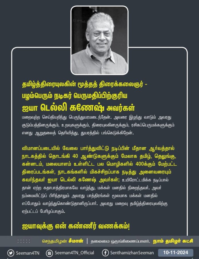 பழம்பெரும் நடிகர் பெருமதிப்பிற்குரிய டெல்லி கணேஷ் அவர்களுக்கு சீமான் கண்ணீர் வணக்கம்!