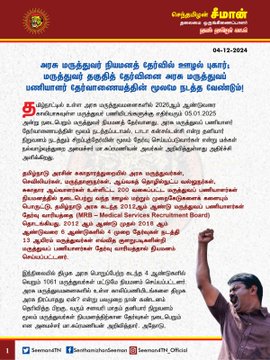 தமிழ்நாட்டில் உள்ள அரசு மருத்துவமனைகளில் 2026ஆம் ஆண்டுவரை காலியாகவுள்ள மருத்துவர் பணியிடங்களுக்கு எதிர்வரும் 05.01.2025 அன்று நடைபெறும் மருத்துவர் நியமனத் தேர்வானது, அரசு மருத்துவப் பணியாளர் தேர்வாணையத்தின் மூலம் நடத்தப்படாமல், டாடா கன்சல்டன்சி என்ற தனியார் நிறுவனம் நடத்தும் சிறப்புத்தேர்வின் மூலம் தேர்வு செய்யப்படுவார்கள் என்று மக்கள் நல்வாழ்வுத்துறை அமைச்சர் மா.சுப்ரமணியன் அவர்கள் அறிவித்துள்ளது அதிர்ச்சி அளிக்கிறது.